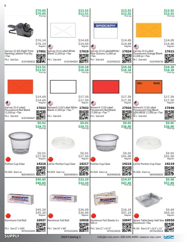 SUPPLY2025 Catalog 3 info@e-nsc.com %u2022 800.690.4444 %u2022 www.e-nsc.comSteam Table Deep Half Size Aluminum +Tax10950Pick Up$0.58$57.69 047552350221Pk:100 Size:12.8%u201d x 10.4%u201d x 2.6%u201d$0.64$64.10RegularAluminum Foil Sheets 6 x 500 ct10947Pick Up$14.57$87.43 047552336355Pk:6 Size:12%u201d x 10.75%u201d$16.19$97.14RegularAluminum Foil Roll10938Pick Up$33.29$33.29 047552332944Pk:1 Size:18%u201d x 500%u2019$36.99$36.99RegularAluminum Foil Roll10937Pick Up$40.85$40.85 047552332449Pk:1 Size:12%u201d x 1000%u2019$45.39$45.39RegularLid for Portion Cup Clear14219Pick Up$0.01$36.90 882934600002Pk:2500 Size:2 oz$0.02$41.00RegularPortion Cup Clear14218Pick Up$0.01$36.90 882934600200Pk:2500 Size:2 oz$0.02$41.00RegularLid for Portion Cup Clear14217Pick Up$0.01$24.75 882934600019Pk:2500 Size:1 oz$0.01$27.50RegularPortion Cup Clear14216Pick Up$0.01$24.75 882934600101Pk:2500 Size:1 oz$0.01$27.50RegularMonarch 1110 Label Flourescent Org/Black GEN/MDSE 17,000 pc +Tax **17046Pick Up$16.18$16.18 Pk:1 Size:strd$17.59$17.59RegularMonarch 1110 Label Flourescent Red Blank 17,000 pc +Tax **17033Pick Up$16.18$16.18 Pk:1 Size:strd$17.59$17.59RegularMonarch 1110 Label White Blank 17,000 pc +Tax **17032Pick Up$16.18$16.18 Pk:1 Size:strd$17.59$17.59RegularGarvey 22-6 Label Flourescent Red Blank 11,000 pc +Tax17023Pick Up$13.51$13.51 011974045607Pk:1 Size:strd$14.69$14.69RegularGarvey 22-6 Label Flourescent Orange Blank 11,000 pc +Tax17021Pick Up$13.51$13.51 011974045706Pk:1 Size:strd$14.69$14.69RegularGarvey 22-6 LabeleWhite/ Blue Grocery 11,000 pc +Tax17024Pick Up$13.51$13.51 011974053107Pk:1 Size:strd$14.69$14.69RegularGarvey 22-6 Label White Blank 11,000 pc +Tax17019Pick Up$13.51$13.51 011974045003Pk:1 Size:strd$14.69$14.69RegularGarvey 22-6(6 Digit) Price Marking Labeler Hvy Dty +Tax17001Pick Up$70.05$70.05 011974060020Pk:1 Size:Gun$76.14$76.14Regular