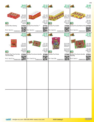 info@e-nsc.com %u2022 800.690.4444 %u2022 www.e-nsc.com 2025 Catalog 3CANDYZumba Pica Goma Sandia Peg Bag37911Pick Up$1.88$37.53 703885035258Pk:20 Size:6 ct$1.92$38.46Asstd 60 cs$2.04$40.79RegularZumba Pica Fiesta37560Pick Up$13.65$81.91 703885018213Pk:6 Size:2.2lbs$13.99$83.94Asstd 60 cs$14.84$89.03RegularZumba Pica Goma Sandia37698Pick Up$7.07$70.73 703885015250Pk:10 Size:15.5 oz$7.25$72.49Asstd 60 cs$7.69$76.88RegularZumba Pica Tiras Forritos Tamarind Bag37693Pick Up$3.53$42.38 703885013928Pk:12 Size:12.3 oz$3.62$43.43Asstd 60 cs$3.84$46.06RegularZumba Pica Zumbarica Pop37708Pick Up$5.89$70.71 703885066405Pk:12 Size:12 ct$6.04$72.46Asstd 60 cs$6.41$76.86RegularZumba Pica Acidin37696Pick Up$7.11$42.68 703885063404Pk:6 Size:10 ct$7.29$43.74Asstd 60 cs$7.73$46.39RegularZumba Pica Hot Disc **37701Pick Up$7.11$42.68 703885063503Pk:6 Size:10 ct$7.29$43.74Asstd 60 cs$7.73$46.39RegularZumba Rica chamoy37664Pick Up$6.02$72.23 703885066412Pk:12 Size:12 ct$6.04$72.45Asstd 60 cs$6.40$76.84Regular