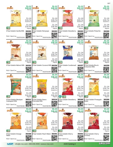 info@e-nsc.com %u2022 800.690.4444 %u2022 www.e-nsc.com 2025 Catalog 3GROCERYD%u2019Gari Gelatin Vanilla Milk36281Pick Up$1.21$29.10 735257013243Pk:24 Size:4.2 oz$1.24$29.76Asstd 60 cs$1.29$30.96RegularD%u2019Gari Gelatin Rompope Milk36282Pick Up$1.21$29.10 735257013236Pk:24 Size:4.2 oz$1.24$29.76Asstd 60 cs$1.29$30.96RegularD%u2019Gari Gelatin Strawberry Milk36283Pick Up$1.21$29.10 735257013205Pk:24 Size:4.2 oz$1.24$29.76Asstd 60 cs$1.29$30.96RegularD%u2019Gari Gelatin Pistachio Milk36284Pick Up$1.21$29.10 735257013229Pk:24 Size:4.2 oz$1.24$29.76Asstd 60 cs$1.29$30.96RegularD%u2019Gari Gelatin Walnut Milk36292Pick Up$1.21$29.10 735257013212Pk:24 Size:4.2 oz$1.24$29.76Asstd 60 cs$1.29$30.96RegularD%u2019Gari Gelatin Coconut Milk36256Pick Up$1.21$29.10 735257013199Pk:24 Size:4.2 oz$1.24$29.76Asstd 60 cs$1.29$30.96RegularD%u2019Gari Gelatin Condensed Milk36257Pick Up$1.21$29.10 735257013250Pk:24 Size:4.2 oz$1.24$29.76Asstd 60 cs$1.29$30.96RegularD%u2019Gari Gelatin Rice & Cinnamon Milk36259Pick Up$1.21$29.10 735257013274Pk:24 Size:4.2 oz$1.24$29.76Asstd 60 cs$1.29$30.96RegularD%u2019Gari Gelatin Marzipan (mazapan) Milk36311Pick Up$1.21$29.10 735257005385Pk:24 Size:4.2 oz$1.24$29.76Asstd 60 cs$1.29$30.96RegularD%u2019Gari Gelatin Ibarra Chocolate Milk36314Pick Up$1.21$29.10 735257005798Pk:24 Size:4.2 oz$1.24$29.76Asstd 60 cs$1.29$30.96RegularD%u2019Gari Gelatin Strawberry Water36289Pick Up$1.21$29.10 735257013106Pk:24 Size:4.2 oz$1.24$29.76Asstd 60 cs$1.29$30.96RegularD %u2018Gari Gelatin Pineapple Water36290Pick Up$1.21$29.10 735257013168Pk:24 Size:4.2 oz$1.24$29.76Asstd 60 cs$1.29$30.96RegularD%u2019Gari Gelatin Orange Water36288Pick Up$1.21$29.10 735257013151Pk:24 Size:4.2 oz$1.24$29.76Asstd 60 cs$1.29$30.96RegularD%u2019Gari Gelatin Peach Water36291Pick Up$1.21$29.10 735257013083Pk:24 Size:4.2 oz$1.24$29.76Asstd 60 cs$1.29$30.96RegularD%u2019Gari Gelatin Sherry (Jerez)36302Pick Up$1.21$29.10 735257013090Pk:24 Size:4.2 oz$1.24$29.76Asstd 60 cs$1.29$30.96RegularD%u2019Gari Gelatin Cherry (Cereza)36310Pick Up$1.21$29.10 735257013113Pk:24 Size:4.2 oz$1.24$29.76Asstd 60 cs$1.29$30.96Regular