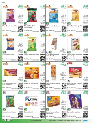 GROCERY2025 Catalog 3 info@e-nsc.com %u2022 800.690.4444 %u2022 www.e-nsc.comGamesa Chocolatines42342Pick Up$4.13$49.57 686700101119Pk:12 Size:11.7 oz$4.49$53.88RegularGamesa Barras de Coco (Classic Line)42260Pick Up$4.08$49.02 686700101300Pk:12 Size:14.3 oz$4.24$50.88Asstd 60 cs$4.44$53.28RegularGamesa Arcoiris42330Pick Up$4.13$49.57 686700101324Pk:12 Size:15.5 oz$4.24$50.88Asstd 60 cs$4.49$53.88RegularGamesa Animal Cookies42256Pick Up$2.24$26.89 686700032673Pk:12 Size:16 oz$2.49$29.88RegularRoyal Flan large (caramel not included)36220Pick Up$1.46$17.55 072392007233Pk:12 Size:3.8 oz$1.59$19.08RegularD%u2019Gari Flan with Caramel Shipper36294Pick Up$1.17$111.90 735257005057Pk:96 Size:4.7 oz$1.19$114.24Asstd 60 cs$1.24$119.04RegularD%u2019Gari Flan with Caramel36293Pick Up$1.21$29.10 735257005057Pk:24 Size:4.7 oz$1.24$29.76Asstd 60 cs$1.29$30.96RegularD%u2019Gari Flan Dessert Mix (Flan de Vanilla)36297Pick Up$1.21$29.10 73525700781Pk:24 Size:4.0 oz$1.29$30.96RegularD%u2019Gari Gelatin Unflavored (Grenetina)36295Pick Up$1.63$39.03 735257013014Pk:24 Size:4 pk$1.73$41.52RegularD%u2019Gari Shipper Mariachi Gelatin Bag **36296Pick Up$1.17$111.90 735257005712Pk:96 Size:4.2 oz$1.24$119.04RegularD%u2019Gari Gelatin Lime Water36287Pick Up$1.21$29.10 735257013137Pk:24 Size:4.2 oz$1.24$29.76Asstd 60 cs$1.29$30.96RegularD%u2019Gari Gelatin Cristal36258Pick Up$1.21$29.10 735257013267Pk:24 Size:4.2 oz$1.24$29.76Asstd 60 cs$1.29$30.96RegularD%u2019Gari Gelatin Mango Water36255Pick Up$1.21$29.10 735257013144Pk:24 Size:4.2 oz$1.24$29.76Asstd 60 cs$1.29$30.96RegularD%u2019Gari Gelatin Blueberry Water36260Pick Up$1.21$29.10 735257013120Pk:24 Size:4.2 oz$1.24$29.76Asstd 60 cs$1.29$30.96RegularD%u2019Gari Gelatin Dark (Oscura) Water36313Pick Up$1.21$29.10 735257005408Pk:24 Size:4.2 oz$1.24$29.76Asstd 60 cs$1.29$30.96RegularD%u2019Gari Gelatin Grape Water36301Pick Up$1.21$29.10 735257013175Pk:24 Size:4.2 oz$1.24$29.76Asstd 60 cs$1.29$30.96Regular