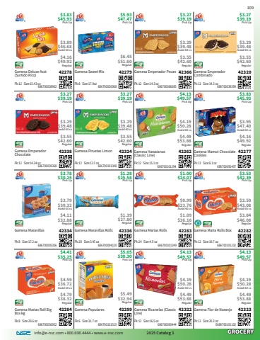 info@e-nsc.com %u2022 800.690.4444 %u2022 www.e-nsc.com 2025 Catalog 3GROCERYGamesa Flor de Naranjo42323Pick Up$4.13$49.57 0686700101102Pk:12 Size:20.3 oz$4.19$50.28Asstd 60 cs$4.49$53.88RegularGamesa Ricanelas (Classic Line)42322Pick Up$4.13$49.57 686700090444Pk:12 Size:16.5 oz$4.19$50.28Asstd 60 cs$4.49$53.88RegularGamesa Populares42299Pick Up$5.05$30.30 686700101515Pk:6 Size:31.7 oz$5.49$32.94RegularGamesa Marias Roll Big Box kg42284Pick Up$4.41$35.25 686700056952Pk:8 Size:29.6 oz$4.59$36.72Asstd 60 cs$4.79$38.32RegularGamesa Maria Rolls Box42282Pick Up$3.53$42.39 686700101232Pk:12 Size:19.7 oz$3.59$43.08Asstd 60 cs$3.84$46.08RegularGamesa Marias Rolls42283Pick Up$1.00$24.07 686700101249Pk:24 Size:4.9 oz$0.99$23.76Asstd 60 cs$1.09$26.16RegularGamesa Maravillas Rolls42336Pick Up$1.28$25.58 686700004120Pk:20 Size:3.45 oz$1.39$27.80RegularGamesa Maravillas42334Pick Up$3.78$30.25 686700005356Pk:8 Size:17.2 oz$3.79$30.32Asstd 60 cs$4.11$32.88RegularGamesa Mamut Chocolate Cookies42277Pick Up$3.83$45.93 686700092407Pk:12 Size:8.1 oz$3.95$47.40Asstd 60 cs$4.16$49.92RegularGamesa Hawaianas (Classic Line)42262Pick Up$4.13$49.57 686700101294Pk:12 Size:15.1 oz$4.19$50.28Asstd 60 cs$4.49$53.88RegularGamesa Piruetas Limon42324Pick Up$3.27$39.19 686700101348Pk:12 Size:12.5 oz$3.29$39.48Asstd 60 cs$3.55$42.60RegularGamesa Emperador Chocolate42338Pick Up$3.27$39.19 686700039368Pk:12 Size:14.34 oz$3.29$39.48Asstd 60 cs$3.55$42.60RegularGamesa Emperador Combinado42320Pick Up$3.27$39.19 686700039399Pk:12 Size:14.3 oz$3.29$39.48Asstd 60 cs$3.55$42.60RegularGamesa Emperador Pecan42366Pick Up$3.27$39.19 686700066685Pk:12 Size:14.3 oz$3.29$39.48Asstd 60 cs$3.55$42.60RegularGamesa Sweet Mix42279Pick Up$5.93$47.47 686700030068Pk:8 Size:17.9oz$6.45$51.60RegularGamesa Deluxe Asst (Surtido Rico)42278Pick Up$3.83$45.93 686700038962Pk:12 Size:15.43 oz$3.89$46.68Asstd 60 cs$4.16$49.92Regular