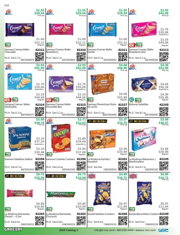 GROCERY2025 Catalog 3 info@e-nsc.com %u2022 800.690.4444 %u2022 www.e-nsc.comDonde Bizcochitos Crackers42209Pick Up$0.89$10.71 724865022259Pk:12 Size:4.8 oz$0.97$11.64RegularDonde Globitos Crackers42208Pick Up$0.89$10.71 724865031251Pk:12 Size:4.8 oz$0.97$11.64RegularLa Moderna Marianitas (Coconut)42202Pick Up$0.75$15.04 038629002228Pk:20 Size:6.53oz$0.80$16.00RegularLa Moderna Marianitas (Pecan) -- 6.5oz42203Pick Up$0.75$15.04 038629100252Pk:20 Size:6.5oz$0.80$16.00RegularLa Moderna Malvavisco / Marshmallow42205Pick Up$3.66$36.57 038629001283Pk:10 Size:14.7 oz$3.89$38.90RegularLa Moderna Surtido / Assorted42201Pick Up$3.37$33.75 038629000910Pk:10 Size:16oz$3.59$35.90RegularGamesa Crackets Crackers42296Pick Up$2.72$32.63 686700101409Pk:12 Size:12.6 oz$2.89$34.68Asstd 60 cs$3.09$37.08RegularGamesa Saladitas Saltine42294Pick Up$2.90$34.74 686700101416Pk:12 Size:14.7 oz$3.10$37.20Asstd 60 cs$3.29$39.48RegularGamesa Saladitas42295Pick Up$4.39$52.69 686700000085Pk:12 Size:16.2 oz$4.69$56.28Asstd 60 cs$4.99$59.88RegularGamesa Florentinas Dulce de Leche42337Pick Up$4.04$48.49 0686700004069Pk:12 Size:11.1 oz$4.49$53.88RegularGamesa Cremax Wafer Chocolate Box42315Pick Up$2.93$41.09 686700000035Pk:14 Size:11.2 oz$2.79$39.06Asstd 60 cs$3.19$44.66RegularGamesa Cremax Wafer Vanilla Box42314Pick Up$2.93$41.09 686700000375Pk:14 Size:11.2 oz$2.79$39.06Asstd 60 cs$3.19$44.66RegularGamesa Cremax Wafer Strawberry Box42313Pick Up$2.93$41.09 686700000368Pk:14 Size:11.2 oz$2.79$39.06Asstd 60 cs$3.19$44.66RegularGamesa Cremax Wafer Vanilla42311Pick Up$1.55$29.54 686700000061Pk:19 Size:5.7 oz$1.69$32.11RegularGamesa Cremax Wafer Strawberry42310Pick Up$1.55$29.54 686700000054Pk:19 Size:5.7 oz$1.69$32.11RegularGamesa Cremax Wafer Chocolate42312Pick Up$1.55$29.54 686700000078Pk:19 Size:5.7 oz$1.69$32.11Regular