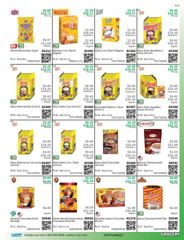 info@e-nsc.com %u2022 800.690.4444 %u2022 www.e-nsc.com 2025 Catalog 3GROCERYIbarra Chocolate Drink Mix39549Pick Up$0.00$0.00 030467000015Pk:12 Size:19 oz$0.00RegularAbuelita Instant Chocolate Mix 8ct42376Pick Up$2.81$33.73 028000525538Pk:12 Size:8 oz$2.99$35.88RegularNestle Abuelita Granulated Chocolate drink Mix39542Pick Up$4.22$25.34 028000299781Pk:6 Size:11.2 oz$4.59$27.54RegularAbuelita Chocolate Drink Mix 6tab39540Pick Up$0.00$0.00 028000157852Pk:12 Size:19 oz$0.00RegularNaturas Champurrado Drink Mix39541Pick Up$2.93$35.22 043757000039Pk:12 Size:12 oz$3.09$37.08Asstd 60 cs$3.19$38.28RegularKlass Atole Chocolate (4x12ct)43369Pick Up$0.39$18.55 754177830396Pk:48 Size:1.52 oz$0.40$19.20Asstd 60 cs$0.42$20.16RegularKlass Atole Corn / Elote (4x12ct)43366Pick Up$0.39$18.55 754177507465Pk:48 Size:1.52 oz$0.40$19.20Asstd 60 cs$0.42$20.16RegularKlass Atole Arroz Con Leche (4x12ct)43367Pick Up$0.39$18.55 754177505553Pk:48 Size:1.52 oz$0.40$19.20Asstd 60 cs$0.42$20.16RegularKlass Atole Guayaba / Guava (4x12ct)43368Pick Up$0.39$18.55 754177505546Pk:48 Size:1.52 oz$0.40$19.20Asstd 60 cs$0.42$20.16RegularKlass Atole Walnut / Nuez (4x12ct)42367Pick Up$0.39$18.55 754177830792Pk:48 Size:1.52 oz$0.40$19.20Asstd 60 cs$0.42$20.16RegularKlass Atole Coco (4x12ct)42364Pick Up$0.39$18.55 754177830426Pk:48 Size:1.52 oz$0.40$19.20Asstd 60 cs$0.42$20.16RegularKlass Atole Vanilla (4x12ct)42369Pick Up$0.39$18.55 754177830419Pk:48 Size:1.52 oz$0.40$19.20Asstd 60 cs$0.42$20.16RegularKlass Atole Strawberry / Fresa (4x12ct)42368Pick Up$0.39$18.55 754177830402Pk:48 Size:1.52 oz$0.40$19.20Asstd 60 cs$0.42$20.16RegularKlass Corn Starch Regular42363Pick Up$2.27$54.37 754177849145Pk:24 Size:14.1 oz$2.33$55.92Asstd 60 cs$2.41$57.84RegularMaizena Corn Starch Regular42362Pick Up$2.34$56.17 048001711273Pk:24 Size:14.1 oz$2.44$58.56Asstd 60 cs$2.49$59.76RegularDonde Bizcochitos Super42212Pick Up$0.89$10.71 724865023287Pk:12 Size:4.8oz$0.97$11.64Regular