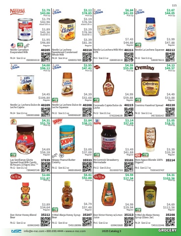 info@e-nsc.com %u2022 800.690.4444 %u2022 www.e-nsc.com 2025 Catalog 3GROCERYH Miel de Abeja Honey Syrup (Glass Jar)35208Pick Up$4.31$103.56 724511222446Pk:24 Size:12 oz$4.69$112.56RegularDon Victor Honey w/Lmon Juice35213Pick Up$4.59$27.54 61994210600Pk:6 Size:12 oz$4.99$29.94RegularH Miel Abeja Honey Syrup Bear35207Pick Up$4.41$52.88 724511280996Pk:12 Size:10 oz$4.79$57.48RegularDon Victor Honey Blend Bear35212Pick Up$2.66$31.87 61994210403Pk:12 Size:12 oz$2.89$34.64RegularMore Agave Blonde 100% Organic35214Pick Up$3.05$18.31 7503014257437Pk:6 Size:12.7 oz$3.39$20.34RegularMcCormick Strawberry Mermalade35101Pick Up$3.14$37.69 052100037523Pk:12 Size:15.8 oz$3.49$41.88RegularSkippy Peanut Butter Creamy35533Pick Up$2.84$34.11 048001006430Pk:12 Size:16.3 oz$3.09$37.08RegularLas Sevillanas Gloria Spread Goat Milk Candy W.Pecans (370gm) Disc **37839Pick Up$4.31$51.78 739944007249Pk:12 Size:13.2 oz$4.69$56.28RegularCremino Hazelnut Spread40220Pick Up$4.13$49.57 045735001417Pk:12 Size:12.3 oz$4.49$53.88RegularCoronado Cajeta Dulce de Leche40215Pick Up$4.59$55.09 074323046199Pk:12 Size:23.3 oz$4.99$59.88RegularNestle La Lechera Dulce de Leche Squeeze40208Pick Up$3.95$47.41 028000656287Pk:12 Size:11.5 oz$4.39$52.68RegularNestle La Lechera Dulce de Leche Cajeta40209Pick Up$4.00$96.12 028000518868Pk:24 Size:13.4 oz$4.45$106.80RegularNestle La Lechera Squeeze40212Pick Up$3.67$44.05 028000706111Pk:12 Size:11.8 oz$3.99$47.88RegularNestle La Lechera Milk Mini 6 PK40211Pick Up$6.84$41.03 028000518110Pk:6 Size:3.5 oz$7.43$44.60RegularNestle La Lechera Sweetened Condensed Whole Milk40210Pick Up$3.12$74.85 028000517809Pk:24 Size:14 oz$3.19 $76.56Asstd 120 cs$3.29$78.96Asstd 60 cs$3.39$81.36RegularNestle Carnation Evaporated Milk40205Pick Up$1.79$43.06 050000010110Pk:24 Size:12 oz$1.79 $42.96Asstd 120 cs$1.89$45.36Asstd 60 cs$1.95$46.80Regular
