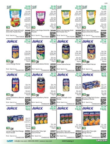 info@e-nsc.com %u2022 800.690.4444 %u2022 www.e-nsc.com 2025 Catalog 3GROCERYJumex Mini Tetra 3pk Mango Nectar20609Pick Up$1.25$10.01 076406051833Pk:8 Size:6.76 oz$1.39$11.12RegularJumx Mini Tetra 3pk Strawberry-Banana Nectar20611Pick Up$1.25$10.01 076406053131Pk:8 Size:6.76 oz$1.39$11.12RegularJumex Mini Tetra 3pk Guava Nectar20607Pick Up$1.25$10.01 076406051632Pk:8 Size:6.76 oz$1.39$11.12RegularJumex Fridge Pack Mango Peach Nectar20561Pick Up$0.71$8.53 076406021086Pk:12 Size:11.3 oz$0.77$9.24Asstd 60 cs$0.79$9.48RegularJumex Fridge Pack GuavaStrawberry Nectar20562Pick Up$0.71$8.53 076406021093Pk:12 Size:11.3 oz$0.77$9.24Asstd 60 cs$0.79$9.48RegularJumex Pineaple Juice Nectar20556Pick Up$0.73$17.46 076406021307Pk:24 Size:11.3 oz$0.79$18.96Asstd 60 cs$0.81$19.40RegularJumex Strawberry Nectar20544Pick Up$0.73$17.46 076406022304Pk:24 Size:11.3 oz$0.79$18.96Asstd 60 cs$0.81$19.40RegularJumex Strawberry Banana Nectar20550Pick Up$0.73$17.46 076406023103Pk:24 Size:11.3 oz$0.79$18.96Asstd 60 cs$0.81$19.40RegularJumex Peach Nectar20542Pick Up$0.73$17.46 076406021901Pk:24 Size:11.3 oz$0.79$18.96Asstd 60 cs$0.81$19.40RegularJumex Guava Nectar20541Pick Up$0.73$17.46 076406021604Pk:24 Size:11.3 oz$0.79$18.96Asstd 60 cs$0.81$19.40RegularJumex Guanabana Nectar20545Pick Up$0.73$17.46 076406022403Pk:24 Size:11.3 oz$0.79$18.96Asstd 60 cs$0.81$19.40RegularJumex Mango Nectar20540Pick Up$0.73$17.46 076406021802Pk:24 Size:11.3 oz$0.79$18.96Asstd 60 cs$0.81$19.40RegularKlass Listo Limonada Pepino Drink Mix Powder20355Pick Up$2.96$53.30 754177507205Pk:18 Size:14.1 oz$2.95 $53.10Asstd 120 cs$3.05$54.90Asstd 60 cs$3.15$56.70RegularKlass Listo Naranja Drink Mix Powder Disc **20354Pick Up$2.96$53.30 754177832949Pk:18 Size:14.1 oz$2.95 $53.10Asstd 120 cs$3.05$54.90Asstd 60 cs$3.15$56.70RegularKlass Listo Grape Drink Mix Powder20349Pick Up$2.96$53.30 754177505621Pk:18 Size:14.1 oz$2.95 $53.10Asstd 120 cs$3.05$54.90Asstd 60 cs$3.15$56.70RegularKlass Listo Tropical Punch Drink Mix Powder Disc **20348Pick Up$2.96$53.30 754177505638Pk:18 Size:14.1 oz$2.95 $53.10Asstd 120 cs$3.05$54.90Asstd 60 cs$3.15$56.70Regular