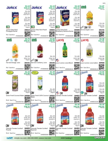 info@e-nsc.com %u2022 800.690.4444 %u2022 www.e-nsc.com 2025 Catalog 3GROCERYClamato Tomato Cocktail Picante20459Pick Up$5.33$42.61 014800512762Pk:8 Size:64 oz$5.59$44.72Asstd 60 cs$5.79$46.32RegularClamato Tomato Cocktail WIC20451Pick Up$5.33$42.61 014800516470Pk:8 Size:64 oz$5.59$44.72Asstd 60 cs$5.79$46.32RegularClamato Tomato Cocktail Especial20456Pick Up$3.03$36.32 014800003604Pk:12 Size:32 oz$3.19$38.28Asstd 60 cs$3.29$39.48RegularClamato Tomato Cocktail Picante20455Pick Up$3.03$36.32 014800512755Pk:12 Size:32 oz$3.19$38.28Asstd 60 cs$3.29$39.48RegularClamato Tomato Cocktail20454Pick Up$3.03$36.32 014800515336Pk:12 Size:32 oz$3.19$38.28Asstd 60 cs$3.29$39.48RegularClamato Tomato Cocktail20452Pick Up$1.85$22.25 014800515329Pk:12 Size:16 oz$2.06$24.72RegularGreen Fresh 100% Coconut Water20583Pick Up$1.34$32.18 025225037143Pk:24 Size:17.5 oz$1.49$35.76RegularGreen Fresh Coconut Water20580Pick Up$1.16$27.86 025225037136Pk:24 Size:17.5 oz$1.29$30.96RegularLucy%u2019s Lemon Juice Gallon20466Pick Up$5.48$21.92 890985000139Pk:4 Size:128 oz$6.09$24.36RegularLucy%u2019s Lemon Juice Blend20465Pick Up$1.67$19.98 890985000122Pk:12 Size:32 oz$1.85$22.20RegularHarvest Cranberry Juice20143Pick Up$3.86$30.89 074390000582Pk:8 Size:64 oz$4.29$34.32RegularHarvest Orange Juice20151Pick Up$5.75$46.01 074390000629Pk:8 Size:64 oz$6.39$51.12RegularHarvest Apple Juice20141Pick Up$2.87$22.97 074390000506Pk:8 Size:64 oz$3.19$25.52RegularJumex Tetra Pack Strawberry-Banana Nectar20606Pick Up$3.14$25.13 076406065608Pk:8 Size:64 oz$3.29 $26.32Asstd 120 cs$3.39$27.12Asstd 60 cs$3.49$27.92RegularJumex Tetra Pack Peach Nectar20602Pick Up$3.14$25.13 076406065707Pk:8 Size:64 oz$3.29 $26.32Asstd 120 cs$3.39$27.12Asstd 60 cs$3.49$27.92RegularJumex Tetra Pack Pineapple Nectar20613Pick Up$3.14$25.13 076406065851Pk:8 Size:64 oz$3.29 $26.32Asstd 120 cs$3.39$27.12Asstd 60 cs$3.49$27.92Regular
