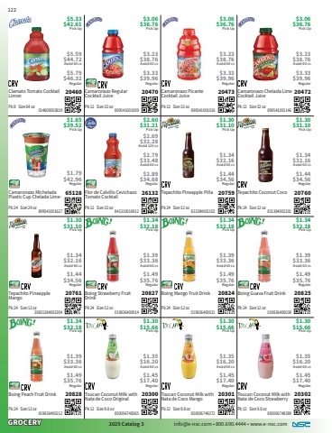 GROCERY2025 Catalog 3 info@e-nsc.com %u2022 800.690.4444 %u2022 www.e-nsc.comToucan Coconut Milk with Nata de Coco Strawberry20302Pick Up$1.30$15.66 850006748389Pk:12 Size:9.8 oz$1.35$16.20Asstd 60 cs$1.45$17.40RegularToucan Coconut Milk with Nata de Coco Mango20301Pick Up$1.30$15.66 850006748372Pk:12 Size:9.8 oz$1.35$16.20Asstd 60 cs$1.45$17.40RegularToucan Coconut Milk with Nata de Coco Original20300Pick Up$1.30$15.66 850006748365Pk:12 Size:9.8 oz$1.35$16.20Asstd 60 cs$1.45$17.40RegularBoing Peach Fruit Drink20828Pick Up$1.34$32.18 019836400212Pk:24 Size:12 oz$1.39$33.36Asstd 60 cs$1.49$35.76RegularBoing Guava Fruit Drink20825Pick Up$1.34$32.18 019836400038Pk:24 Size:12 oz$1.39$33.36Asstd 60 cs$1.49$35.76RegularBoing Mango Fruit Drink20824Pick Up$1.34$32.18 019836400021Pk:24 Size:12 oz$1.39$33.36Asstd 60 cs$1.49$35.76RegularBoing Strawberry Fruit Drink20827Pick Up$1.34$32.18 019836400014Pk:24 Size:12 oz$1.39$33.36Asstd 60 cs$1.49$35.76RegularTepachito Pineapple Mango20761Pick Up$1.30$31.10 20831384002304Pk:24 Size:12 oz$1.34$32.16Asstd 60 cs$1.44$34.56RegularTepachito Coconut Coco20760Pick Up$1.30$31.10 831384002201Pk:24 Size:12 oz$1.34$32.16Asstd 60 cs$1.44$34.56RegularTepachito Pineapple Pi%u00f1a20759Pick Up$1.30$31.10 831384002102Pk:24 Size:12 oz$1.34$32.16Asstd 60 cs$1.44$34.56RegularFlor de Calvillo Cevichazo Tomato Cocktail26132Pick Up$2.60$31.21 841310016912Pk:12 Size:32 oz$2.69 $32.28Asstd 120 cs$2.79$33.48Asstd 60 cs$2.89$34.68RegularCamaronazo Michelada Plastic Cup Chelada Lime-65128Pick Up$1.65$39.52 899541001627Pk:24 Size:24 oz$1.79$42.96RegularCamaronazo Chelada Lime Cocktail Juice20472Pick Up$3.06$36.76 899541001146Pk:12 Size:32 oz$3.23$38.76Asstd 60 cs$3.33$39.96RegularCamaronazo Picante Cocktail Juice20473Pick Up$3.06$36.76 899541001016Pk:12 Size:32 oz$3.23$38.76Asstd 60 cs$3.33$39.96RegularCamaronazo Regular Cocktail Juice20470Pick Up$3.06$36.76 899541001009Pk:12 Size:32 oz$3.23$38.76Asstd 60 cs$3.33$39.96RegularClamato Tomato Cocktail Limon20460Pick Up$5.33$42.61 014800003819Pk:8 Size:64 oz$5.59$44.72Asstd 60 cs$5.79$46.32Regular