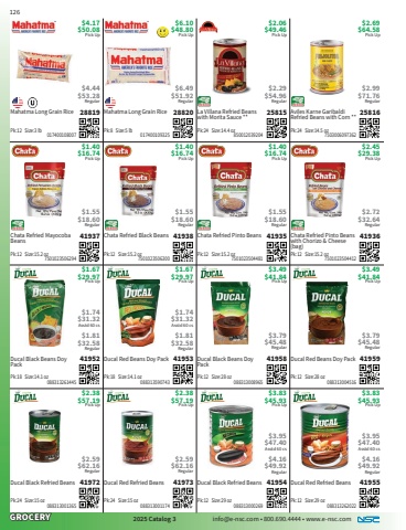 GROCERY2025 Catalog 3 info@e-nsc.com %u2022 800.690.4444 %u2022 www.e-nsc.comDucal Red Refried Beans41955Pick Up$3.83$45.93 088313262022Pk:12 Size:29 oz$3.95$47.40Asstd 60 cs$4.16$49.92RegularDucal Black Refried Beans41954Pick Up$3.83$45.93 088313000269Pk:12 Size:29 oz$3.95$47.40Asstd 60 cs$4.16$49.92RegularDucal Red Refried Beans41973Pick Up$2.38$57.19 088313001174Pk:24 Size:15 oz$2.59$62.16RegularDucal Black Refried Beans41972Pick Up$2.38$57.19 088313001365Pk:24 Size:15 oz$2.59$62.16RegularDucal Red Beans Doy Pack41959Pick Up$3.49$41.84 088313004516Pk:12 Size:28 oz$3.79$45.48RegularDucal Black Beans Doy Pack41958Pick Up$3.49$41.84 088313008965Pk:12 Size:28 oz$3.79$45.48RegularDucal Red Beans Doy Pack41953Pick Up$1.67$29.97 088313590743Pk:18 Size:14.1 oz$1.74$31.32Asstd 60 cs$1.81$32.58RegularDucal Black Beans Doy Pack41952Pick Up$1.67$29.97 088313261445Pk:18 Size:14.1 oz$1.74$31.32Asstd 60 cs$1.81$32.58RegularChata Refried Pinto Beans with Chorizo & Cheese (bag)41936Pick Up$2.45$29.38 7501023504412Pk:12 Size:15.2 oz$2.72$32.64RegularChata Refried Pinto Beans41935Pick Up$1.40$16.74 7501023504481Pk:12 Size:15.2 oz$1.55$18.60RegularChata Refried Black Beans41938Pick Up$1.40$16.74 7501023506300Pk:12 Size:15.2 oz$1.55$18.60RegularChata Refried Mayocoba Beans41937Pick Up$1.40$16.74 7501023506294Pk:12 Size:15.2 oz$1.55$18.60RegularAviles Karne Garibaldi Refried Beans with Corn **25816Pick Up$2.69$64.58 7503006097362Pk:24 Size:14.5 oz$2.99$71.76RegularLa Villana Refried Beans with Morita Sauce **25815Pick Up$2.06$49.46 850012039204Pk:24 Size:14.4 oz$2.29$54.96RegularMahatma Long Grain Rice28820Pick Up$6.10$48.80 017400109325Pk:8 Size:5 lb$6.49$51.92RegularMahatma Long Grain Rice28819Pick Up$4.17$50.08 017400108007Pk:12 Size:3 lb$4.44$53.28Regular