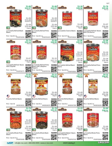 info@e-nsc.com %u2022 800.690.4444 %u2022 www.e-nsc.com 2025 Catalog 3GROCERYLa Coste%u00f1a Whole Pinto Beans41948Pick Up$2.84$34.11 076397035604Pk:12 Size:29 oz$3.09$37.08RegularLa Coste%u00f1a Refried Beans with Chipotle **41965Pick Up$2.15$25.81 076397037103Pk:12 Size:19.75oz$2.39$28.68RegularLa Coste%u00f1a Whole Black Beans41944Pick Up$1.78$21.42 076397032009Pk:12 Size:19.75 oz$1.89$22.68Asstd 60 cs$1.94$23.28RegularLa Coste%u00f1a Whole Pinto Beans41941Pick Up$1.78$21.42 076397031002Pk:12 Size:19.75 oz$1.89$22.68Asstd 60 cs$1.94$23.28RegularRosarita Refried Beans41934Pick Up$4.22$50.67 044300106390Pk:12 Size:40.5 oz$4.59$55.08RegularRosarita Refried Beans Spicy41922Pick Up$3.21$38.53 044300107380Pk:12 Size:30 oz$3.49$41.88RegularRosarita Refried Beans41932Pick Up$3.21$38.53 044300106376Pk:12 Size:30 oz$3.49$41.88RegularRosarita Refried Beans41930Pick Up$1.83$21.97 044300106321Pk:12 Size:1 lb$1.99$23.88RegularLa Coste%u00f1a Refried Pinto Beans41940Pick Up$2.96$35.53 076397035000Pk:12 Size:28.9 oz$3.19$38.28Asstd 10 cs$3.29$39.48RegularLa Coste%u00f1a Refried Black Beans41942Pick Up$2.96$35.53 076397035505Pk:12 Size:28.9 oz$3.19$38.28Asstd 60 cs$3.29$39.48RegularLa Coste%u00f1a Refried Pinto Beans with Jalapeno Peppers41966Pick Up$2.08$24.95 076397037202Pk:12 Size:20.4oz$2.31$27.72RegularLa Coste%u00f1a Refried Beans with Chipotle41964Pick Up$2.76$33.16 076397032771Pk:12 Size:20.5oz$3.07$36.84RegularLa Coste%u00f1a Refried Beans with Chicharron41963Pick Up$2.76$33.16 076397032658Pk:12 Size:20.5oz$3.07$36.84RegularLa Coste%u00f1a Charros Beans41962Pick Up$2.34$28.08 076397032634Pk:12 Size:19.75 oz$2.60$31.20RegularLa Coste%u00f1a Refried Pinto Beans41943Pick Up$1.88$22.57 076397031507Pk:12 Size:20.5 oz$1.99$23.88Asstd 60 cs$2.09$25.08RegularLa Coste%u00f1a Refried Black Beans41945Pick Up$1.88$22.57 076397032504Pk:12 Size:20.5 oz$1.99$23.88Asstd 60 cs$2.09$25.08Regular