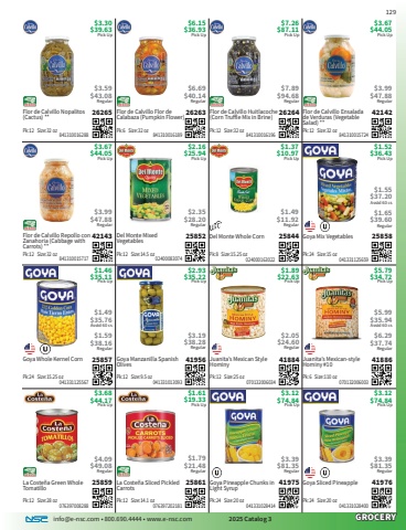 info@e-nsc.com %u2022 800.690.4444 %u2022 www.e-nsc.com 2025 Catalog 3GROCERYGoya Sliced Pineapple41976Pick Up$3.12$74.84 041331028400Pk:24 Size:20 oz$3.39$81.35RegularGoya Pineapple Chunks in Light Syrup41975Pick Up$3.12$74.84 041331028414Pk:24 Size:20 oz$3.39$81.35RegularLa Coste%u00f1a Sliced Pickled Carrots25861Pick Up$1.61$19.33 076397202181Pk:12 Size:14.1 oz$1.79$21.48RegularLa Coste%u00f1a Green Whole Tomatillo25859Pick Up$3.68$44.17 076397008288Pk:12 Size:28 oz$4.09$49.08RegularJuanita%u2019s Mexican-style Hominy #1041886Pick Up$5.79$34.72 070132006003Pk:6 Size:110 oz$5.99$35.94Asstd 60 cs$6.29$37.74RegularJuanita%u2019s Mexican Style Hominy41884Pick Up$1.89$22.63 070132006034Pk:12 Size:25 oz$2.05$24.60RegularGoya Manzanilla Spanish Olives41956Pick Up$2.93$35.22 041331013093Pk:12 Size:9.5 oz$3.19$38.28RegularGoya Whole Kernel Corn25857Pick Up$1.46$35.11 041331125567Pk:24 Size:15.25 oz$1.49$35.76Asstd 60 cs$1.59$38.16RegularGoya Mix Vegetables25858Pick Up$1.52$36.43 041331125659Pk:24 Size:15 oz$1.55$37.20Asstd 60 cs$1.65$39.60RegularDel Monte Whole Corn25844Pick Up$1.37$10.97 024000163022Pk:8 Size:15.25 oz$1.49$11.92RegularDel Monte Mixed Vegetables25852Pick Up$2.16$25.94 02400083074Pk:12 Size:14.5 oz$2.35$28.20RegularFlor de Calvillo Repollo con Zanahoria (Cabbage with Carrots) **42143Pick Up$3.67$44.05 841310015717Pk:12 Size:32 oz$3.99$47.88RegularFlor de Calvillo Ensalada de Verduras (Vegetable Salad) **42142Pick Up$3.67$44.05 841310015724Pk:12 Size:32 oz$3.99$47.88RegularFlor de Calvillo Huitlacoche (Corn Truffle Mix in Brine)26264Pick Up$7.26$87.11 841310016196Pk:12 Size:32 oz$7.89$94.68RegularFlor de Calvillo Flor de Calabaza (Pumpkin Flower)26263Pick Up$6.15$36.93 841310016189Pk:6 Size:32 oz$6.69$40.14RegularFlor de Calvillo Nopalitos (Cactus) **26265Pick Up$3.30$39.63 841310016288Pk:12 Size:32 oz$3.59$43.08Regular
