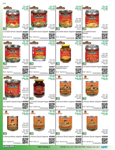 GROCERY2025 Catalog 3 info@e-nsc.com %u2022 800.690.4444 %u2022 www.e-nsc.comLa Morena Sliced Jalape%u00f1o42064Pick Up$3.12$37.43 727452000319Pk:12 Size:28.2 oz$3.39$40.68RegularLa Morena Sliced Jalape%u00f1o42069Pick Up$1.92$23.07 727452000326Pk:12 Size:13.13 oz$2.09$25.08RegularLa Morena Sliced Jalape%u00f1o42068Pick Up$1.28$30.69 727452000333Pk:24 Size:7 oz$1.39$33.36RegularLa Morena Whole Jalape%u00f1o42063Pick Up$2.39$28.62 727452000111Pk:12 Size:28.2 oz$2.55$30.63Asstd 60 cs$2.65$31.80RegularLa Morena Whole Jalape%u00f1o42067Pick Up$1.65$19.76 727452000128Pk:12 Size:13.13 oz$1.79$21.48RegularLa Morena Whole Jalape%u00f1o42066Pick Up$1.06$25.39 727452000135Pk:24 Size:7 oz$1.15$27.60RegularLa Coste%u00f1a Chipotle Pepper Glass42096Pick Up$2.66$31.91 076397030166Pk:12 Size:8.11 oz$2.89$34.68RegularLa Coste%u00f1a Chipotle Pepper42099Pick Up$3.58$42.95 076397004129Pk:12 Size:12 oz$3.79$45.48Asstd 60 cs$3.89$46.68RegularLa Coste%u00f1a Chipotle Pepper42098Pick Up$1.83$43.94 076397004075Pk:24 Size:7 oz$1.89$45.36Asstd 60 cs$1.99$47.76RegularLa Coste%u00f1a Nacho Jalape%u00f1o Glass42095Pick Up$2.29$27.49 076397105116Pk:12 Size:15.5 oz$2.49$29.88RegularLa Coste%u00f1a Nacho Jalape%u00f1o42097Pick Up$2.01$24.18 076397005119Pk:12 Size:12 oz$2.19$26.28RegularLa Coste%u00f1a Serrano Peppers42093Pick Up$1.70$20.41 076397003122Pk:12 Size:12 oz$1.89$22.68RegularLa Coste%u00f1a Serrano Peppers42092Pick Up$1.16$27.86 076397003078Pk:24 Size:7 oz$1.29$30.96RegularLa Coste%u00f1a Sliced Jalape%u00f1o42089Pick Up$2.51$30.13 076397002286Pk:12 Size:28 oz$2.69$32.28Asstd 60 cs$2.79$33.48RegularLa Coste%u00f1a sliced Jalape%u00f1o42088Pick Up$1.79$21.49 076397002125Pk:12 Size:12 oz$1.99$23.88RegularLa Coste%u00f1a Sliced Jalape%u00f1o42087Pick Up$1.16$27.86 076397002071Pk:24 Size:7 oz$1.29$30.96Regular