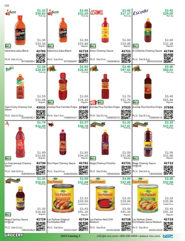 GROCERY2025 Catalog 3 info@e-nsc.com %u2022 800.690.4444 %u2022 www.e-nsc.comLas Palmas Green Enchiladas Sauce Medium41733Pick Up$3.09$37.04 041501110218Pk:12 Size:28 oz$3.33$39.96Asstd 60 cs$3.43$41.16RegularLas Palmas Red Chili Medium41726Pick Up$3.09$37.04 041501100288Pk:12 Size:28 oz$3.33$39.96Asstd 60 cs$3.43$41.16RegularLas Palmas Original Enchiladas Mild41734Pick Up$3.09$37.04 041501110287Pk:12 Size:28 oz$3.33$39.96Asstd 60 cs$3.43$41.16RegularMega Chamoy Sauce Original41729Pick Up$1.25$15.01 738545020626Pk:12 Size:12.5 oz$1.39$16.68RegularMega Chamoy Sauce Original41732Pick Up$2.33$27.97 738545020043Pk:12 Size:33.8 oz$2.59$31.08RegularMega Chamoy Picosito41731Pick Up$2.33$27.97 738545020442Pk:12 Size:33.8oz$2.59$31.08RegularDon Pepe Chamoy Sauce41741Pick Up$2.57$30.78 819063002568Pk:12 Size:34.5 oz$2.85$34.20RegularLa Guacamaya Chamoy Sauce41730Pick Up$1.79$21.49 050959000149Pk:12 Size:33.81 oz$1.99$23.88RegularZumba Pica Forritos Pulpa37908Pick Up$5.05$60.61 703885043710Pk:12 Size:35.3 oz$5.49$65.88RegularZumba Pica Forritos Pulpa37935Pick Up$3.40$47.62 703885063725Pk:14 Size:20.1 oz$3.70$51.76RegularZumba Pica Forritos Pulpa37907Pick Up$1.92$26.92 703885042317Pk:14 Size:7.4 oz$2.09$29.26RegularTajin Fruity Chamoy Hot Sauce43532Pick Up$2.38$28.59 633148100617Pk:12 Size:15.38 oz$2.59$31.08RegularEl Chilerito Chamoy Sauce41780Pick Up$2.42$29.05 20647541022036Pk:12 Size:33.8 oz$2.69$32.28RegularAmor Chamoy Sauce41721Pick Up$1.43$17.17 724836088161Pk:12 Size:33 oz$1.59$19.08RegularValentina Salsa Black41719Pick Up$2.69$32.29 097339000047Pk:12 Size:34 oz$2.99$35.88RegularValentina salsa Black41703Pick Up$1.25$30.02 097339000061Pk:24 Size:12.5 oz$1.39$33.36Regular