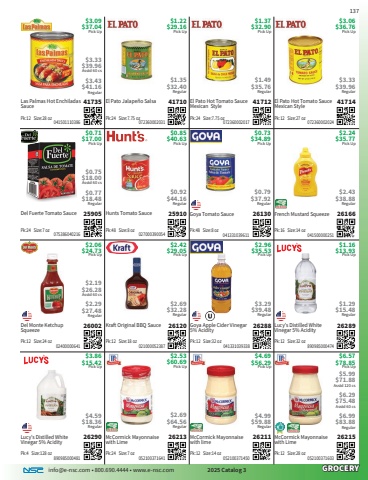 info@e-nsc.com %u2022 800.690.4444 %u2022 www.e-nsc.com 2025 Catalog 3GROCERYMcCormick Mayonnaise with Lime26215Pick Up$6.57$78.85 052100371603Pk:12 Size:28 oz$5.99 $71.88Asstd 120 cs$6.29$75.48Asstd 60 cs$6.99$83.88RegularMcCormick Mayonnaise with lime26211Pick Up$4.69$56.29 052100371450Pk:12 Size:14 oz$4.99$59.88RegularMcCormick Mayonnaise with Lime26213Pick Up$2.53$60.69 052100371641Pk:24 Size:7 oz$2.69$64.56RegularLucy%u2019s Distilled White Vinegar 5% Acidity26290Pick Up$3.86$15.42 890985000481Pk:4 Size:128 oz$4.59$18.36RegularLucy%u2019s Distilled White Vinegar 5% Acidity26289Pick Up$1.16$13.93 890985000474Pk:12 Size:32 oz$1.29$15.48RegularGoya Apple Cider Vinegar 5% Acidity26288Pick Up$2.96$35.53 041331039338Pk:12 Size:32 oz$3.29$39.48RegularKraft Original BBQ Sauce26120Pick Up$2.42$29.05 021000052387Pk:12 Size:18 oz$2.69$32.28RegularDel Monte Ketchup Squeeze26002Pick Up$2.06$24.73 02400000641Pk:12 Size:24 oz$2.19$26.28Asstd 60 cs$2.29$27.48RegularFrench Mustard Squeeze26166Pick Up$2.24$35.77 041500000251Pk:16 Size:14 oz$2.43$38.88RegularGoya Tomato Sauce26130Pick Up$0.73$34.89 041331039611Pk:48 Size:8 oz$0.79$37.92RegularHunts Tomato Sauce25910Pick Up$0.85$40.63 027000390054Pk:48 Size:8 oz$0.92$44.16RegularDel Fuerte Tomato Sauce25905Pick Up$0.71$17.00 075386040216Pk:24 Size:7 oz$0.75$18.00Asstd 60 cs$0.77$18.48RegularEl Pato Hot Tomato Sauce Mexican Style41714Pick Up$3.06$36.76 072360002024Pk:12 Size:27 oz$3.33$39.96RegularEl Pato Hot Tomato Sauce Mexican Style41712Pick Up$1.37$32.90 072360002017Pk:24 Size:7.75 oz$1.49$35.76RegularEl Pato Jalape%u00f1o Salsa41710Pick Up$1.22$29.16 072360002031Pk:24 Size:7.75 oz$1.35$32.40RegularLas Palmas Hot Enchiladas Sauce41735Pick Up$3.09$37.04 041501110386Pk:12 Size:28 oz$3.33$39.96Asstd 60 cs$3.43$41.16Regular