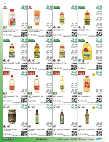 GROCERY2025 Catalog 3 info@e-nsc.com %u2022 800.690.4444 %u2022 www.e-nsc.comCiuti Garlic X-Virgin Olive Oil26945Pick Up$5.44$65.31 040232669637Pk:12 Size:16.9 oz$5.79$69.48RegularCiuti 100% Pure Avocado Oil26943Pick Up$5.14$61.71 094922474872Pk:12 Size:16.9 oz$5.59$67.08RegularCampeone X-Virgin Olive Oil 100%26950Pick Up$5.16$30.96 610795269508Pk:6 Size:16.9 oz$5.49$32.94RegularCiuti Organic Refined Coconut Oil26944Pick Up$4.69$56.29 040232491764Pk:12 Size:14 oz$4.99$59.88Regular1-2-3 vegetable oil26958Pick Up$13.43$53.73 7501026000119Pk:4 Size:128 oz$14.29$57.16Regular1-2-3 canola oil26959Pick Up$3.47$41.62 012005000596Pk:12 Size:1 L$3.49$41.88Asstd 60 cs$3.69$44.28Regular1-2-3 Vegetable Oil Red Label26953Pick Up$3.47$41.62 75002343Pk:12 Size:1 L$3.49$41.88Asstd 60 cs$3.69$44.28Regular1-2-3 Vegetable Oil Red Label26954Pick Up$1.78$42.64 012005000091Pk:24 Size:16.9 oz$1.89$45.36RegularMazola Corn Oil26920Pick Up$15.03$90.18 761720058206Pk:6 Size:gal$14.99 $89.94Asstd 120 cs$15.49$92.94Asstd 60 cs$15.99$95.94RegularMazola Corn Oil Plus26921Pick Up$4.88$58.54 761720987520Pk:12 Size:40 oz$4.89 $58.68Asstd 120 cs$4.99$59.88Asstd 60 cs$5.19$62.28RegularMazola Canola Oil26911Pick Up$4.88$58.54 761720987506Pk:12 Size:40 oz$4.89 $58.68Asstd 120 cs$4.99$59.88Asstd 60 cs$5.19$62.28RegularMazola Vegetable Plus Oil26919Pick Up$4.88$58.54 761720987513Pk:12 Size:40 oz$4.89 $58.68Asstd 120 cs$4.99$59.88Asstd 60 cs$5.19$62.28RegularMazola Corn Oil26913Pick Up$4.88$58.54 761720987490Pk:12 Size:40 oz$4.89 $58.68Asstd 120 cs$4.99$59.88Asstd 60 cs$5.19$62.28RegularMazola Corn Oil26910Pick Up$2.96$35.53 761720056202Pk:12 Size:16 oz$3.29$39.48RegularMcCormick Mayonnaise Chipotle Squeeze26217Pick Up$3.88$23.29 052100057231Pk:6 Size:10.3 oz$4.13$24.78RegularMcCormick Mayonnaise Squeeze with Lime26216Pick Up$3.66$21.94 052100057224Pk:6 Size:10.3 oz$3.89$23.34Regular