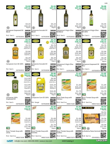 info@e-nsc.com %u2022 800.690.4444 %u2022 www.e-nsc.com 2025 Catalog 3GROCERYLa Moderna Pasta Vermiceli42170Pick Up$0.53$10.62 029243000011Pk:20 Size:7 oz$0.53 $10.60Asstd 120 cs$0.56$11.20Asstd 60 cs$0.59$11.80RegularKnorr Tomato Soup with Coditos28546Pick Up$1.65$19.76 048001716179Pk:12 Size:3.5 oz$1.69$20.28Asstd 60 cs$1.79$21.48RegularKnorr Tomato Soup with Estrellas28544Pick Up$1.65$19.76 048001716193Pk:12 Size:3.5 oz$1.69$20.28Asstd 60 cs$1.79$21.48RegularKnorr Tomato Soup with Letras28542Pick Up$1.65$19.76 048001716186Pk:12 Size:3.5 oz$1.69$20.28Asstd 60 cs$1.79$21.48RegularKnorr Tomato Soup with Fideo28540Pick Up$1.65$19.76 048001716162Pk:12 Size:3.5 oz$1.69$20.28Asstd 60 cs$1.79$21.48RegularKnorr Pasta Soup with Chicken28547Pick Up$1.65$19.76 048001716285Pk:12 Size:3.5 oz$1.69$20.28Asstd 60 cs$1.79$21.48RegularCampeone Corn Oil 100%26930Pick Up$9.86$59.16 010795269308Pk:6 Size:gal$9.99 $59.94Asstd 120 cs$10.29$61.74Asstd 60 cs$10.49$62.94RegularCampeone 100% Grapeseed Oil26941Pick Up$10.57$63.42 010795269414Pk:6 Size:2 L$12.59 $75.54Asstd 120 cs$12.99$77.94Asstd 60 cs$11.49$68.94RegularCampeone Grapeseed Oil Plus26933Pick Up$5.79$34.72 010795269339Pk:6 Size:2 L$5.79 $34.74Asstd 120 cs$5.99$35.94Asstd 60 cs$6.29$37.74RegularCampeone X-Virgin Olive Oil Plus26934Pick Up$5.79$34.72 010795269346Pk:6 Size:2 L$5.79 $34.74Asstd 120 cs$5.99$35.94Asstd 60 cs$6.29$37.74RegularCampeone Avocado Oil Plus26938Pick Up$5.79$34.72 010795269384Pk:6 Size:2 L$5.79 $34.74Asstd 120 cs$5.99$35.94Asstd 60 cs$6.29$37.74RegularCampeone Corn Oil 100%26932Pick Up$5.79$34.72 010795269322Pk:6 Size:2 L$5.79 $34.74Asstd 120 cs$5.99$35.94Asstd 60 cs$6.29$37.74RegularCampeone X-Virgin Olive Oil 100%26948Pick Up$8.88$53.30 610795269485Pk:6 Size:1 L$9.45$56.70RegularCampeone X-Virgin Olive Oil Blend26935Pick Up$3.94$47.26 010795269353Pk:12 Size:1 L$4.19$50.28RegularCampeone Avocado Oil Blend26936Pick Up$3.94$47.26 010795269360Pk:12 Size:1 L$4.19$50.28RegularCampeone Grapeseed Oil Blend26939Pick Up$3.94$47.26 010795269391Pk:12 Size:1 L$4.19$50.28Regular