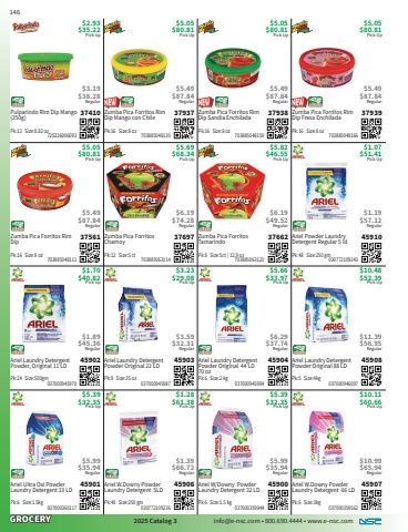 GROCERY2025 Catalog 3 info@e-nsc.com %u2022 800.690.4444 %u2022 www.e-nsc.comAriel W.Downy Powder Laundry Detergent 66 LD45907Pick Up$10.11$60.66 037000359562Pk:6 Size:3kg$10.99$65.94RegularAriel W/Downy Powder Laundry Detergent 32 LD45900Pick Up$5.39$32.35 037000359944Pk:6 Size:1.5 kg$5.99$35.94RegularAriel W.Downy Powder Laundry Detergent 5LD45906Pick Up$1.28$61.38 030772109236Pk:48 Size:250 gm$1.39$66.72RegularAriel Ultra Oxi Powder Laundry Detergent 33 LD45901Pick Up$5.39$32.35 037000360117Pk:6 Size:1.5kg$5.99$35.94RegularAriel Laundry Detergent Powder Original 88 LD45908Pick Up$10.48$52.39 037000946007Pk:5 Size:4kg$11.39$56.95RegularAriel Laundry Detergent Powder Original 44 LD 70 oz45904Pick Up$5.66$33.97 037000945994Pk:6 Size:2 kg$6.29$37.74RegularAriel Laundry Detergent Powder Original 22 LD45903Pick Up$3.23$29.08 037000945987Pk:9 Size:35 oz$3.59$32.31RegularAriel Laundry Detergent Powder, Original 11 LD45902Pick Up$1.70$40.82 037000945970Pk:24 Size:500gm$1.89$45.36RegularAriel Powder Laundry Detergent Regular 5 ld45910Pick Up$1.07$51.41 030772109243Pk:48 Size:250 gm$1.19$57.12RegularZumba Pica Forritos Tamarindo37662Pick Up$5.82$46.55 703885063121Pk:8 Size:5ct / 12.9 oz$6.19$49.52RegularZumba Pica Forritos Chamoy37697Pick Up$5.69$68.34 703885063114Pk:12 Size:5 ct$6.19$74.28RegularZumba Pica Forritos Rim Dip37561Pick Up$5.05$80.81 703885048111Pk:16 Size:8 oz$5.49$87.84RegularZumba Pica Forritos Rim Dip Fresa Enchilada37939Pick Up$5.05$80.81 703885048166Pk:16 Size:8 oz$5.49$87.84RegularZumba Pica Forritos Rim Dip Sandia Enchilada37938Pick Up$5.05$80.81 703885048159Pk:16 Size:8 oz$5.49$87.84RegularZumba Pica Forritos Rim Dip Mango con Chile37937Pick Up$5.05$80.81 703885048135Pk:16 Size:8 oz$5.49$87.84RegularPulparindo Rim Dip Mango (250g)37410Pick Up$2.93$35.22 725226006093Pk:12 Size:8.82 oz$3.19$38.28Regular