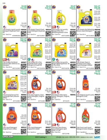 GROCERY2025 Catalog 3 info@e-nsc.com %u2022 800.690.4444 %u2022 www.e-nsc.comTide Front Load Liquid Detergent Green (Import)49561Pick Up$3.75$45.01 4987176179906Pk:12 Size:850 ml$3.99$47.88RegularTide Plus Ultra Downy Liquid Detergent, April Fresh, 21 Lds49538Pick Up$7.89$47.32 03077217496Pk:6 Size:30 oz$8.39$50.34RegularTide Liquid Detergent Original HE (32lds)49437Pick Up$11.18$67.06 030772121177Pk:6 Size:42 oz$11.89$71.34RegularTide Liquid Detergent Original Scent (19lds)49512Pick Up$6.29$37.73 037000138754Pk:6 Size:25 oz$5.99$35.94Asstd 60 cs$6.69$40.14RegularTide Original Liquid Laudry Detergent (6 lds)49527Pick Up$2.81$33.73 037000004714Pk:12 Size:10 oz$2.99$35.88RegularTide Bleach Alternative Liquid Detergent, Original, 29 Lds49541Pick Up$10.05$60.29 3077212270Pk:6 Size:42 oz$10.69$64.14RegularTide Ultra Hygienic Clean Liquid Detergent, Original 24 Lds49537Pick Up$7.89$47.32 0377212280Pk:6 Size:34 oz$8.39$50.34RegularTide SimplyClean & Frsh Liq Detrgnt Berry Blossm (89lds)49563Pick Up$11.27$45.08 30772120801Pk:4 Size:117 oz$10.99 $43.96Asstd 120 cs$11.39$45.56Asstd 60 cs$11.99$47.96RegularTide Simply Clean & Sensitive Cool Cotton Liquid Detergent (89lds)49547Pick Up$11.27$45.08 030772120828Pk:4 Size:117 oz$10.99 $43.96Asstd 120 cs$11.39$45.56Asstd 60 cs$11.99$47.96RegularTide Simply Liq Laundry Dtrgnt Refrshng Breeze All In One 89lds49553Pick Up$11.27$45.08 030772120781Pk:4 Size:117 oz$10.99 $43.96Asstd 120 cs$11.39$45.56Asstd 60 cs$11.99$47.96RegularTide Simply All in One Daybreak Fresh Liquid Detergent 89 loads HE49545Pick Up$11.27$45.08 030772120798Pk:4 Size:117 oz$10.99 $43.96Asstd 120 cs$11.39$45.56Asstd 60 cs$11.99$47.96RegularTide Simply+Oxi Boost Febreze Odor Defense Liq Detergent49567Pick Up$11.27$45.08 030772115947Pk:4 Size:105 oz$11.99$47.96RegularTide Simply+Oxi Refreshing Breeze Liquid Detergent **49546Pick Up$11.27$45.08 030772118610Pk:4 Size:105 oz$10.99 $43.96Asstd 120 cs$11.39$45.56Asstd 60 cs$11.99$47.96RegularTide Simply Liq Laundry Detrgnt All In One Refreshing Breeze 32Lds49566Pick Up$5.67$34.01 030772120859Pk:6 Size:42 oz$6.03$36.18RegularTide Simply Clean & Fresh Liquid Detergent Daybreak Fresh49534Pick Up$4.22$25.32 030772120927Pk:6 Size:32 oz$4.49$26.94RegularTide Simply Liquid Laundry Detergent Daybreak Fresh HE49550Pick Up$3.66$21.94 037000903918Pk:6 Size:25 oz$3.89$23.34Regular
