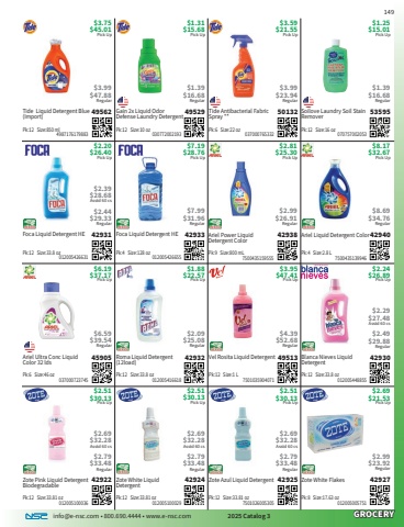 info@e-nsc.com %u2022 800.690.4444 %u2022 www.e-nsc.com 2025 Catalog 3GROCERYZote White Flakes42927Pick Up$2.69$21.53 012005005751Pk:8 Size:17.63 oz$2.99$23.92RegularZote Azul Liquid Detergent42925Pick Up$2.51$30.13 7501026005305Pk:12 Size:33.81 oz$2.69$32.28Asstd 60 cs$2.79$33.48RegularZote White Liquid Detergent42924Pick Up$2.51$30.13 012005100029Pk:12 Size:33.81 oz$2.69$32.28Asstd 60 cs$2.79$33.48RegularZote Pink Liquid Detergent Biodegradable42922Pick Up$2.51$30.13 012005100036Pk:12 Size:33.81 oz$2.69$32.28Asstd 60 cs$2.79$33.48RegularBlanca Nieves Liquid Detergent42930Pick Up$2.24$26.89 012005448855Pk:12 Size:33.8 oz$2.29$27.48Asstd 60 cs$2.49$29.88RegularVel Rosita Liquid Detergent49513Pick Up$3.95$47.41 7501035904071Pk:12 Size:1 L$4.39$52.68RegularRoma Liquid Detergent (12load)42932Pick Up$1.88$22.57 012005416618Pk:12 Size:33.8 oz$2.09$25.08RegularAriel Ultra Conc Liquid Color 32 lds45905Pick Up$6.19$37.17 037000723745Pk:6 Size:46 oz$6.59$39.54RegularAriel Liquid Detergent Color42940Pick Up$8.17$32.67 7500435139946Pk:4 Size:2.8 L$8.69$34.76RegularAriel Power Liquid Detergent Color42938Pick Up$2.81$25.30 7500435159555Pk:9 Size:800 mL$2.99$26.91RegularFoca Liquid Detergent HE42933Pick Up$7.19$28.76 012005426655Pk:4 Size:128 oz$7.99$31.96RegularFoca Liquid Detergent HE42931Pick Up$2.20$26.40 012005426631Pk:12 Size:33.8 oz$2.39$28.68Asstd 60 cs$2.44$29.33RegularSoilove Laundry Soil Stain Remover53595Pick Up$1.25$15.01 070757002053Pk:12 Size:16 oz$1.39$16.68RegularTide Antibacterial Fabric Spray **50132Pick Up$3.59$21.55 037000765332Pk:6 Size:22 oz$3.99$23.94RegularGain 2x Liquid Odor Defense Laundry Detergent49529Pick Up$1.31$15.68 030772002193Pk:12 Size:10 oz$1.39$16.68RegularTide Liquid Detergent Blue (Import)49562Pick Up$3.75$45.01 4987176179883Pk:12 Size:850 ml$3.99$47.88Regular
