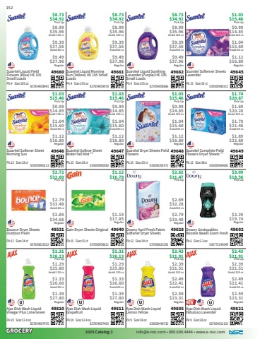 GROCERY2025 Catalog 3 info@e-nsc.com %u2022 800.690.4444 %u2022 www.e-nsc.comAjax Dish Wash Liquid Fabuloso Lavender49821Pick Up$2.43$21.91 827854011153Pk:9 Size:28 oz$2.39 $21.51Asstd 120 cs$2.49$22.41Asstd 60 cs$2.59$23.31RegularAjax Dish Wash Liquid Lemon Yellow49805Pick Up$2.43$21.91 035000446732Pk:9 Size:28 oz$2.39 $21.51Asstd 120 cs$2.49$22.41Asstd 60 cs$2.59$23.31RegularAjax Dish Wash Liquid Grapefruit49811Pick Up$1.31$26.13 827854007463Pk:20 Size:12.4 oz$1.29 $25.80Asstd 120 cs$1.33$26.60Asstd 60 cs$1.39$27.80RegularAjax Dish Wash Liquid Vinegar Plus Lime Green49810Pick Up$1.31$26.13 827854007470Pk:20 Size:12.4 oz$1.29 $25.80Asstd 120 cs$1.33$26.60Asstd 60 cs$1.39$27.80RegularDowny Unstopables Booster Beads Scent Fresh49602Pick Up$3.09$18.56 030772143049Pk:6 Size:3.3 oz$3.29$19.74RegularDowny April Fresh Fabric Softener Dryer Sheets49628Pick Up$2.62$31.47 037000823292Pk:12 Size:34 ct$2.69$32.28Asstd 60 cs$2.79$33.48RegularGain Dryer Sheets Original49640Pick Up$1.12$16.78 037000958611Pk:15 Size:15 ct$1.19$17.85RegularBounce Dryer Sheets Outdoor Fresh49531Pick Up$2.72$32.60 037000823322Pk:12 Size:34 ct$2.79$33.48Asstd 60 cs$2.89$34.68RegularSuavitel Complete Field Flowers Dryer Sheets **49649Pick Up$1.74$20.87 035000969682Pk:12 Size:36ct$1.69 $20.28Asstd 120 cs$1.79$21.48Asstd 60 cs$1.89$22.68RegularSuavitel Dryer Sheets Field Flowers49648Pick Up$1.03$15.46 035000391971Pk:15 Size:20 ct$0.99 $14.85Asstd 120 cs$1.04$15.60Asstd 60 cs$1.12$16.80RegularSuavitel Softner Sheet Water Fall Mist **49647Pick Up$1.03$15.46 035000980380Pk:15 Size:18 ct$0.99 $14.85Asstd 120 cs$1.04$15.60Asstd 60 cs$1.12$16.80RegularSuavitel Softener Sheet Morning Sun49646Pick Up$1.03$15.46 035000980113Pk:15 Size:18 ct$0.99 $14.85Asstd 120 cs$1.04$15.60Asstd 60 cs$1.12$16.80RegularSuavitel Softerner Sheets Lavender49645Pick Up$1.03$15.46 035000980311Pk:15 Size:18 ct$0.99 $14.85Asstd 120 cs$1.04$15.60Asstd 60 cs$1.12$16.80RegularSuavitel Liquid Soothing Lavender (Purple) HE 105 Small Loads49662Pick Up$8.73$34.92 827854008866Pk:4 Size:105 oz$8.99 $35.96Asstd 120 cs$9.39$37.56Asstd 60 cs$9.49$37.96RegularSuavitel Liquid Morning Sun (Yellow) HE 105 Small Loads49661Pick Up$8.73$34.92 827854009078Pk:4 Size:105 oz$8.99 $35.96Asstd 120 cs$9.39$37.56Asstd 60 cs$9.49$37.96RegularSuavitel Liquid Field Flowers (Blue) HE 105 Small Loads49660Pick Up$8.73$34.92 827854008941Pk:4 Size:105 oz$8.99 $35.96Asstd 120 cs$9.39$37.56Asstd 60 cs$9.49$37.96Regular