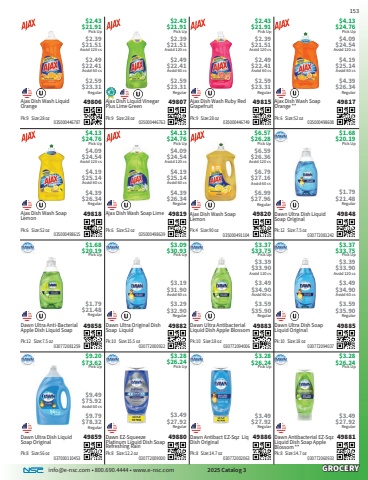 info@e-nsc.com %u2022 800.690.4444 %u2022 www.e-nsc.com 2025 Catalog 3GROCERYDawn Antibacterial EZ-Sqz Liquid Dish Soap Apple Blossom **49881Pick Up$3.28$26.24 030772060933Pk:8 Size:14.7 oz$3.49$27.92RegularDawn Antibact EZ-Sqz Liq Dish Original49886Pick Up$3.28$26.24 030772002063Pk:8 Size:14.7 oz$3.49$27.92RegularDawn EZ-Squeeze Platinum Liquid Dish Soap Refreshing Rain49880Pick Up$3.28$26.24 030772009000Pk:8 Size:12.2 oz$3.49$27.92RegularDawn Ultra Dish Liquid Soap Original49859Pick Up$9.20$73.62 037000110453Pk:8 Size:56 oz$9.49$75.92Asstd 60 cs$9.79$78.32RegularDawn Ultra Dish Soap Liquid Original49885Pick Up$3.37$33.75 030772094037Pk:10 Size:18 oz$3.39 $33.90Asstd 120 cs$3.49$34.90Asstd 60 cs$3.59$35.90RegularDawn Ultra Antibacterial Liquid Dish Apple Blossom49883Pick Up$3.37$33.75 030772094006Pk:10 Size:18 oz$3.39 $33.90Asstd 120 cs$3.49$34.90Asstd 60 cs$3.59$35.90RegularDawn Ultra Original Dish Soap Liquid49882Pick Up$3.09$30.93 030772000922Pk:10 Size:15.5 oz$3.19$31.90Asstd 60 cs$3.29$32.90RegularDawn Ultra Anti-Bacterial Apple Dish Liquid Soap49858Pick Up$1.68$20.19 030772081259Pk:12 Size:7.5 oz$1.79$21.48RegularDawn Ultra Dish Liquid Soap Original49848Pick Up$1.68$20.19 030772081242Pk:12 Size:7.5 oz$1.79$21.48RegularAjax Dish Wash Soap Lemon49820Pick Up$6.57$26.28 035000491104Pk:4 Size:90 oz$6.59 $26.36Asstd 120 cs$6.79$27.16Asstd 60 cs$6.99$27.96RegularAjax Dish Wash Soap Lime49819Pick Up$4.13$24.76 035000498639Pk:6 Size:52 oz$4.09 $24.54Asstd 120 cs$4.19$25.14Asstd 60 cs$4.39$26.34RegularAjax Dish Wash Soap Lemon49818Pick Up$4.13$24.76 035000498615Pk:6 Size:52 oz$4.09 $24.54Asstd 120 cs$4.19$25.14Asstd 60 cs$4.39$26.34RegularAjax Dish Wash Soap Orange **49817Pick Up$4.13$24.76 035000498608Pk:6 Size:52 oz$4.09 $24.54Asstd 120 cs$4.19$25.14Asstd 60 cs$4.39$26.34RegularAjax Dish Wash Ruby Red Grapefruit49815Pick Up$2.43$21.91 035000446749Pk:9 Size:28 oz$2.39 $21.51Asstd 120 cs$2.49$22.41Asstd 60 cs$2.59$23.31RegularAjax Dish Liquid Vinegar Plus Lime Green49807Pick Up$2.43$21.91 035000446763Pk:9 Size:28 oz$2.39 $21.51Asstd 120 cs$2.49$22.41Asstd 60 cs$2.59$23.31RegularAjax Dish Wash Liquid Orange49806Pick Up$2.43$21.91 035000446787Pk:9 Size:28 oz$2.39 $21.51Asstd 120 cs$2.49$22.41Asstd 60 cs$2.59$23.31Regular