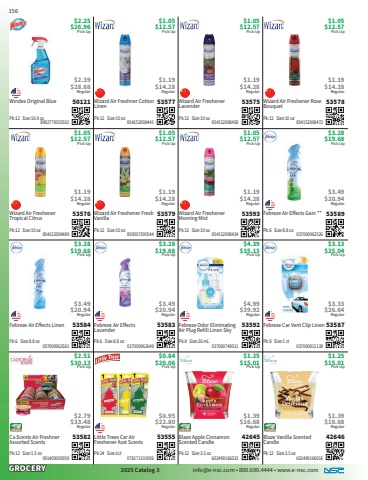 GROCERY2025 Catalog 3 info@e-nsc.com %u2022 800.690.4444 %u2022 www.e-nsc.comBlaze Vanilla Scented Candle42646Pick Up$1.25$15.01 602499166016Pk:12 Size:3.5 oz$1.39$16.68RegularBlaze Apple Cinnamon Scented Candle42645Pick Up$1.25$15.01 602499166023Pk:12 Size:3.5 oz$1.39$16.68RegularLittle Trees Car Air Freshener Asst Scents53555Pick Up$0.84$20.06 076171101006Pk:24 Size:1ct$0.95$22.80RegularCa Scents Air Freshner Assorted Scents53582Pick Up$2.51$30.13 091400000059Pk:12 Size:1.5 oz$2.79$33.48RegularFebreze Car Vent Clip Linen53587Pick Up$3.13$25.04 037000811138Pk:8 Size:1 ct$3.33$26.64RegularFebreze Odor Eliminating Air Plug Refill Linen Sky53592Pick Up$4.39$35.13 037000749011Pk:8 Size:26 mL$4.99$39.92RegularFebreze Air Effects Lavender53583Pick Up$3.28$19.68 037000962649Pk:6 Size:8.8 oz$3.49$20.94RegularFebreze Air Effects Linen53584Pick Up$3.28$19.68 037000962561Pk:6 Size:8.8 oz$3.49$20.94RegularFebreze Air Effects Gain **53589Pick Up$3.28$19.68 037000962526Pk:6 Size:8.8 oz$3.49$20.94RegularWizard Air Freshener Morning Mist53593Pick Up$1.05$12.57 854152008434Pk:12 Size:10 oz$1.19$14.28RegularWizard Air Freshener Fresh Vanilla53579Pick Up$1.05$12.57 850007395544Pk:12 Size:10 oz$1.19$14.28RegularWizard Air Freshener Tropical Citrus53576Pick Up$1.05$12.57 854152008489Pk:12 Size:10 oz$1.19$14.28RegularWizard Air Freshener Rose Bouquet53578Pick Up$1.05$12.57 854152008472Pk:12 Size:10 oz$1.19$14.28RegularWizard Air Freshener Lavender53575Pick Up$1.05$12.57 854152008458Pk:12 Size:10 oz$1.19$14.28RegularWizard Air Freshner Cotton Linen53577Pick Up$1.05$12.57 854152008441Pk:12 Size:10 oz$1.19$14.28RegularWindex Original Blue50121Pick Up$2.25$26.96 8992779255502Pk:12 Size:16.9 oz$2.39$28.68Regular
