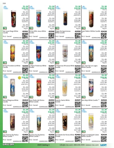 GROCERY2025 Catalog 3 info@e-nsc.com %u2022 800.690.4444 %u2022 www.e-nsc.comVirgen Caridad del Cobre White Candle **42434Pick Up$1.34$16.09 602499161516Pk:12 Size:tall$1.33 $15.99Asstd 120 cs$1.39$16.68Asstd 60 cs$1.49$17.88RegularSan Martin De Porres White Candle42403Pick Up$1.34$16.09 602499161097Pk:12 Size:tall$1.33 $15.99Asstd 120 cs$1.39$16.68Asstd 60 cs$1.49$17.88RegularNuestra Sra De Fatima White Candle **42556Pick Up$1.34$16.09 602499132202Pk:12 Size:tall$1.33 $15.99Asstd 120 cs$1.39$16.68Asstd 60 cs$1.49$17.88RegularSan Antonio De Padua White Candle **42405Pick Up$1.34$16.09 602499161158Pk:12 Size:tall$1.33 $15.99Asstd 120 cs$1.39$16.68Asstd 60 cs$1.49$17.88RegularSan Alejo White Candle **42563Pick Up$1.34$16.09 602499161417Pk:12 Size:tall$1.33 $15.99Asstd 120 cs$1.39$16.68Asstd 60 cs$1.49$17.88RegularEspiritu Santo White Candle42547Pick Up$1.34$16.09 602499161349Pk:12 Size:tall$1.33 $15.99Asstd 120 cs$1.39$16.68Asstd 60 cs$1.49$17.88RegularGran Poder del Divino White Candle42553Pick Up$1.34$16.09 602499161066Pk:12 Size:tall$1.33 $15.99Asstd 120 cs$1.39$16.68Asstd 60 cs$1.49$17.88RegularMaria Milagrosa White Candle42414Pick Up$1.34$16.09 602499161134Pk:12 Size:tall$1.33 $15.99Asstd 120 cs$1.39$16.68Asstd 60 cs$1.49$17.88RegularSan Juan De Los Lagos White Candle42412Pick Up$1.34$16.09 602499161103Pk:12 Size:tall$1.33 $15.99Asstd 120 cs$1.39$16.68Asstd 60 cs$1.49$17.88Regular7 Potencias Africanas White Candle42410Pick Up$1.34$16.09 602499161295Pk:12 Size:tall$1.33 $15.99Asstd 120 cs$1.39$16.68Asstd 60 cs$1.49$17.88RegularLa Mano Poderosa White Candle42407Pick Up$1.34$16.09 602499161141Pk:12 Size:tall$1.33 $15.99Asstd 120 cs$1.39$16.68Asstd 60 cs$1.49$17.88RegularDivina Providencia White Candle42559Pick Up$1.34$16.09 602499161059Pk:12 Size:tall$1.33 $15.99Asstd 120 cs$1.39$16.68Asstd 60 cs$1.49$17.88RegularJuan Pablo II White Candle **42430Pick Up$1.34$16.09 602499161486Pk:12 Size:tall$1.33 $15.99Asstd 120 cs$1.39$16.68Asstd 60 cs$1.49$17.88RegularVirgen De Apariciones White Candle42550Pick Up$1.34$16.09 602499162162Pk:12 Size:tall$1.33 $15.99Asstd 120 cs$1.39$16.68Asstd 60 cs$1.49$17.88RegularDivino Ni%u00f1o Jesus White Candle42546Pick Up$1.34$16.09 602499161257Pk:12 Size:tall$1.33 $15.99Asstd 120 cs$1.39$16.68Asstd 60 cs$1.49$17.88RegularSan Juan Diego White Candle42561Pick Up$1.34$16.09 602499161189Pk:12 Size:tall$1.33 $15.99Asstd 120 cs$1.39$16.68Asstd 60 cs$1.49$17.88Regular