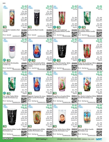 GROCERY2025 Catalog 3 info@e-nsc.com %u2022 800.690.4444 %u2022 www.e-nsc.comJust Juez White Candle Michelada Cup42620Pick Up$1.61$19.33 602499161820Pk:12 Size:lrg cup$1.59 $19.08Asstd 120 cs$1.69$20.28Asstd 60 cs$1.79$21.48RegularSanto Toribio Romo White Candle Michelada Cup **42619Pick Up$1.61$19.33 602499161592Pk:12 Size:lrg cup$1.59 $19.08Asstd 120 cs$1.69$20.28Asstd 60 cs$1.79$21.48RegularVirgen Aparaciones White Candle Michelada Cup42618Pick Up$1.61$19.33 602499161578Pk:12 Size:lrg cup$1.59 $19.08Asstd 120 cs$1.69$20.28Asstd 60 cs$1.79$21.48RegularSanta Muerte White Candle Michelada Cup42615Pick Up$1.61$19.33 602499161622Pk:12 Size:lrg cup$1.59 $19.08Asstd 120 cs$1.69$20.28Asstd 60 cs$1.79$21.48RegularSan Martin Caballero White Candle Michelada Cup42614Pick Up$1.61$19.33 602499161561Pk:12 Size:lrg cup$1.59 $19.08Asstd 120 cs$1.69$20.28Asstd 60 cs$1.79$21.48RegularAngel De La Guarda White Candle Michelada Cup42611Pick Up$1.61$19.33 602499161585Pk:12 Size:lrg cup$1.59 $19.08Asstd 120 cs$1.69$20.28Asstd 60 cs$1.79$21.48RegularSagrado Corazon De Jesus White Candle Michelada Cup42612Pick Up$1.61$19.33 602499161554Pk:12 Size:lrg cup$1.59 $19.08Asstd 120 cs$1.69$20.28Asstd 60 cs$1.79$21.48RegularSan Judas Tadeo White Candle Michelada Cup42613Pick Up$1.61$19.33 602499161547Pk:12 Size:lrg cup$1.59 $19.08Asstd 120 cs$1.69$20.28Asstd 60 cs$1.79$21.48RegularVirgen De Guadalupe White Candle Michelada Cup42610Pick Up$1.61$19.33 602499161530Pk:12 Size:lrg cup$1.59 $19.08Asstd 120 cs$1.69$20.28Asstd 60 cs$1.79$21.48RegularVel Mex Micheladita White Santa Muerte Candle **42644Pick Up$1.43$17.17 602499166914Pk:12 Size:Sml cup$1.49$17.88Asstd 60 cs$1.59$19.08RegularVel Mex Micheladita White Sagrado Corazon de Jesus Candle42643Pick Up$1.43$17.17 602499166891Pk:12 Size:Sml cup$1.49$17.88Asstd 60 cs$1.59$19.08RegularSolid White Micheladita Candle Cup42642Pick Up$1.43$17.17 602499165859Pk:12 Size:Sml cup$1.49$17.88Asstd 60 cs$1.59$19.08RegularSan Judas Tadeo Micheladita White Candle Cup42641Pick Up$1.43$17.17 602499166907Pk:12 Size:Sml cup$1.49$17.88Asstd 60 cs$1.59$19.08RegularVirgen De Guadalupe Micheladita White Candle Cup42640Pick Up$1.43$17.17 602499166884Pk:12 Size:Sml cup$1.49$17.88Asstd 60 cs$1.59$19.08RegularLa Muerte Black Candle42456Pick Up$1.43$17.17 602499162254Pk:12 Size:tall$1.39 $16.68Asstd 120 cs$1.49$17.88Asstd 60 cs$1.59$19.08RegularSan Martin Caballero Red Candle42408Pick Up$1.43$17.17 602499162575Pk:12 Size:tall$1.39 $16.68Asstd 120 cs$1.49$17.88Asstd 60 cs$1.59$19.08Regular