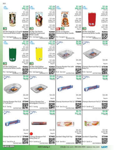 GROCERY2025 Catalog 3 info@e-nsc.com %u2022 800.690.4444 %u2022 www.e-nsc.comSandwich Zipper Bag57340Pick Up$0.90$21.54 691374450654Pk:24 Size:42 ct$1.02$24.48RegularSandwich Bag Fold Top57334Pick Up$0.71$17.11 029900212559Pk:24 Size:80 ct$0.81$19.44RegularChamps Aluminum Foil Heavy Duty 12%u201d57443Pick Up$0.00$0.00 010795574433Pk:24 Size:80 sq. ft$0.00RegularChamps Aluminum Foil 12%u201d57444Pick Up$0.00$0.00 010795574440Pk:12 Size:200 sq. ft$0.00RegularChamps Aluminum Foil 12%u201d57442Pick Up$0.00$0.00 010795574426Pk:24 Size:80 sq. ft$0.00RegularChamps Aluminum Foil 12%u201d57440Pick Up$0.00$0.00 010795574402Pk:24 Size:25 sq. ft$0.00RegularChamps Roaster Pan Rectangular 17x12x2.7%u201d57545Pick Up$0.00$0.00 010795575454Pk:75 Size:lrg$0.00RegularChamps Roaster Pan Oval 17.7x13.8x3.1%u201d57544Pick Up$0.00$0.00 010795575447Pk:75 Size:lrg$0.00RegularChamps Aluminum Pan 1/2 Deep 2ct57540Pick Up$0.00$0.00 010795575409Pk:50 Size:med$0.00RegularChamps Roaster Pan with Lid Medium57541Pick Up$0.00$0.00 010795575416Pk:24 Size:med$0.00RegularVel Mex Solid Yellow Ceremonial White Candle42663Pick Up$7.19$43.15 602499167737Pk:6 Size:Gigante cup$7.49 $44.94Asstd 120 cs$7.69$46.14Asstd 60 cs$7.99$47.94RegularVel Mex Solid Green Ceremonial White Candle42662Pick Up$7.19$43.15 6024991677778Pk:6 Size:Gigante cup$7.49 $44.94Asstd 120 cs$7.69$46.14Asstd 60 cs$7.99$47.94RegularVel Mex Solid Red Ceremonial White Candle42661Pick Up$7.19$43.15 602499167747Pk:6 Size:Gigante cup$7.49 $44.94Asstd 120 cs$7.69$46.14Asstd 60 cs$7.99$47.94RegularDia de Los Muertos Ceremonial White Candle42664Pick Up$7.19$43.15 602499167358Pk:6 Size:giant cup$7.49 $44.94Asstd 120 cs$7.69$46.14Asstd 60 cs$7.99$47.94RegularVel Mex San Martin Caballero Ceremonial White Candle42660Pick Up$7.19$43.15 602499167693Pk:6 Size:Gigante cup$7.49 $44.94Asstd 120 cs$7.69$46.14Asstd 60 cs$7.99$47.94RegularVel Mex Angel de La Guarda Ceremonial White Candle42659Pick Up$7.19$43.15 602499167785Pk:6 Size:Gigante cup$7.49 $44.94Asstd 120 cs$7.69$46.14Asstd 60 cs$7.99$47.94Regular