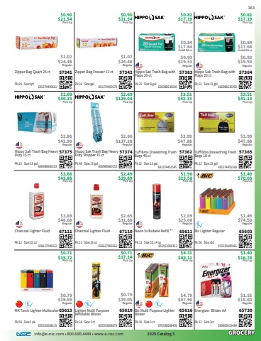 info@e-nsc.com %u2022 800.690.4444 %u2022 www.e-nsc.com 2025 Catalog 3GROCERYEnergizer Blister AA65730Pick Up$1.40$16.74 039800015464Pk:12 Size:2ct$1.55$18.60RegularBic Multi Purpose Lighter Blister65616Pick Up$4.31$43.11 070330608450Pk:10 Size:1 ct$4.79$47.90RegularLighter Multi Purpose Refillable Blister65610Pick Up$0.71$17.14 855553008078Pk:24 Size:1 ct$0.79$19.05RegularMK Torch Lighter Multicolor65613Pick Up$0.71$35.72 855553008115Pk:50 Size:1 pk$0.79$39.69RegularBic Lighter Regular65603Pick Up$1.40$70.03 070330600065Pk:50 Size:std$1.49$74.50RegularNeon 5x Butane Refill **65611Pick Up$1.96$23.58 855553008153Pk:12 Size:10.14 oz$2.09$25.08RegularCharcoal Lighter Fluid67110Pick Up$2.49$29.89 028617009162Pk:12 Size:16 oz$2.65$31.80RegularCharcoal Lighter Fluid67111Pick Up$3.66$43.88 028617009322Pk:12 Size:32 oz$3.89$46.68RegularTuff Bros Drawstring Trash Bags 18 ct57365Pick Up$3.51$42.13 691374451569Pk:12 Size:33 gal$3.99$47.88RegularTuff Bros Drawstring Trash Bags 45 ct57362Pick Up$3.51$42.13 691374451545Pk:12 Size:13 gal$3.99$47.88RegularHippo Sak Trash Bag Heavy Duty Shipper 15 ct57374Pick Up$2.69$129.04 606988660153Pk:48 Size:13 gal$2.86$137.28RegularHippo Sak Trash Bag Heavy Duty 15 ct57375Pick Up$2.69$40.33 606988660153Pk:15 Size:13 gal$2.86$42.90RegularHippo Sak Trash Bag with Flaps 20 ct57364Pick Up$0.82$17.19 606988630200Pk:21 Size:13 gal$0.84$17.64Asstd 60 cs$0.93$19.53RegularHippo Sak Trash Bag with Flaps 20 ct57363Pick Up$0.82$17.19 606988630026Pk:21 Size:8 gal$0.84$17.64Asstd 60 cs$0.93$19.53RegularZipper Bag Freezer 12 ct57342Pick Up$0.90$21.54 691374450678Pk:24 Size:gal$1.02$24.48RegularZipper Bag Quart 25 ct57341Pick Up$0.90$21.54 691374450661Pk:24 Size:qrt$1.02$24.48Regular