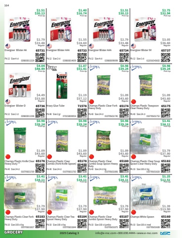 GROCERY2025 Catalog 3 info@e-nsc.com %u2022 800.690.4444 %u2022 www.e-nsc.comChamps White Spoon65160Pick Up$1.25$12.51 010795651608Pk:10 Size:100 ct med$1.39$13.90RegularChamps Plastic Clear Jumbo Spoon Heavy Duty65187Pick Up$3.41$34.11 010795651875Pk:10 Size:100 ct jumbo$3.79$37.90RegularChamps Plastic Clear Tea Spoon Heavy Duty65184Pick Up$3.41$34.11 010795651844Pk:10 Size:100 ct lrg$3.79$37.90RegularChamps Plastic Clear Fork Heavy Duty65183Pick Up$3.41$34.11 010795651837Pk:10 Size:100 ct lrg$3.79$37.90RegularChamps Plastic Clear Soup Spoon Clear Heavy Duty65182Pick Up$3.41$34.11 010795651820Pk:10 Size:100 ct lrg$3.79$37.90RegularChamps Plastic Clear Jumbo Soup Spoon Heavy Duty65180Pick Up$0.98$39.24 010795651806Pk:40 Size:24 ct lrg$1.09$43.60RegularChamps Plastic Clear Combo (Fork-Knife-Spoon)65178Pick Up$0.98$39.24 010795651783Pk:40 Size:24 ct$1.09$43.60RegularChamps Plastic Knife Clear Heavy Duty **65176Pick Up$0.98$39.24 010795651769Pk:40 Size:24 ct$1.09$43.60RegularChamps Plastic Teaspoon Clear Heavy Duty65175Pick Up$0.98$39.24 010795651752Pk:40 Size:24 ct$1.09$43.60RegularChamps Plastic Clear Fork Heavy Duty65174Pick Up$0.98$39.24 010795651745Pk:40 Size:24 ct$1.09$43.60RegularKrazy Glue Tube71578Pick Up$1.07$51.41 070158000054Pk:48 Size:2 gr$1.19$57.12RegularEnergizer Blister D65736Pick Up$4.04$48.49 039800011398Pk:12 Size:2 ct$4.49$53.88RegularEnergizer Blister 9V65737Pick Up$2.75$32.94 612016543602Pk:12 Size:1 ct$3.05$36.60RegularEnergizer Blister AAA65734Pick Up$2.51$30.13 039800099099Pk:12 Size:4 ct$2.79$33.48RegularEnergizer Blister AAA65733Pick Up$1.40$16.74 039800014009Pk:12 Size:2 ct$1.55$18.60RegularEnergizer Blister AA65731Pick Up$2.51$30.13 039800011329Pk:12 Size:4 ct$2.79$33.48Regular