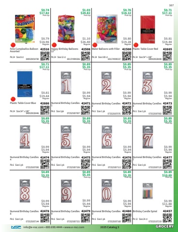 info@e-nsc.com %u2022 800.690.4444 %u2022 www.e-nsc.com 2025 Catalog 3GROCERYBirthday Candle Spiral42457Pick Up$0.89$10.69 073525107219Pk:12 Size:24 ct$0.99$11.88RegularNumeral Birthday Candles 042480Pick Up$0.89$5.35 073525007168Pk:6 Size:1 pk$0.99$5.94RegularNumeral Birthday Candles 942479Pick Up$0.89$5.35 073525007151Pk:6 Size:1 pk$0.99$5.94RegularNumeral Birthday Candles 842478Pick Up$0.89$5.35 073525007144Pk:6 Size:1 pk$0.99$5.94RegularNumeral Birthday Candles 742477Pick Up$0.89$5.35 073525007120Pk:6 Size:1 pk$0.99$5.94RegularNumeral Birthday Candles 642476Pick Up$0.89$5.35 073525007113Pk:6 Size:1 pk$0.99$5.94RegularNumeral Birthday Candles 542475Pick Up$0.89$5.35 073525007106Pk:6 Size:1 pk$0.99$5.94RegularNumeral Birthday Candles 442474Pick Up$0.89$5.35 073525007090Pk:6 Size:1 pk$0.99$5.94RegularNumeral Birthday Candles 342473Pick Up$0.89$5.35 073525007083Pk:6 Size:1 pk$0.99$5.94RegularNumeral Birthday Candles 242472Pick Up$0.89$5.35 073525007076Pk:6 Size:1 pk$0.99$5.94RegularNumeral Birthday Candles 142471Pick Up$0.89$5.35 073525007007Pk:6 Size:1pk$0.99$5.94RegularPlastic Table Cover Blue42666Pick Up$0.71$17.11 840929028446Pk:24 Size:54%u201d x 108%u201d$0.81$19.44RegularPlastic Table Cover Red42665Pick Up$0.71$17.11 840929028408Pk:24 Size:54%u201d x 108%u201d$0.81$19.44RegularWater Balloons with Filler42500Pick Up$0.76$18.12 691374999337Pk:24 Size:100 ct$0.80$19.28RegularHappy Birthday Balloons 12%u201d42508Pick Up$1.03$24.82 691374999306Pk:24 Size:12 ct$1.10$26.40RegularFeliz Cumplea%u00f1os Balloon Assorted42516Pick Up$0.74$17.82 840929054780Pk:24 Size:8 ct$0.79$18.96Regular