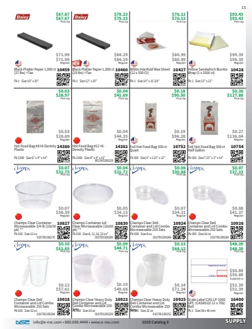 info@e-nsc.com %u2022 800.690.4444 %u2022 www.e-nsc.com 2025 Catalog 3SUPPLYScale Label CAS LP-1000 UPC (CAS8010) 12 x 700/ Roll16400Pick Up$48.20$48.20 Pk:1 Size:58 x 40 mm$50.89$50.89Asstd 60 cs$52.39$52.39RegularChamps Clear Heavy Duty Deli Container and Lid Combo Microwavable 250 Sets10925Pick Up$0.13$64.12 010795109253Pk:500 Size:32 oz$0.14$71.24RegularChamps Clear Heavy Duty Deli Container and Lid Combo Microwavable 250 Sets10923Pick Up$0.09$44.71 010795109239Pk:500 Size:16 oz$0.10$49.68RegularChamps Clear Deli Container and Lid Combo Microwavable 250 Sets10928Pick Up$0.10$51.85 010795109284Pk:500 Size:32 oz$0.12$57.61RegularChamps Clear Deli Container and Lid Combo Microwavable 250 Sets10926Pick Up$0.07$37.23 010795109260Pk:500 Size:16 oz$0.08$41.37RegularChamps Clear Deli Container and Lid Combo Microwavable 250 Sets10924Pick Up$0.06$30.88 010795109246Pk:500 Size:8 oz$0.07$34.31RegularChamps Container Lid Clear Microwavable (10x50 pk) **10830Pick Up$0.04$21.72 010795108300Pk:500 Size:8, 12, 16, 32 oz%u201d$0.05$24.13RegularChamps Clear Container Microwavable 3/4 lb (10x50 pk) **10827Pick Up$0.07$32.75 010795108270Pk:500 Size:12 oz$0.07$36.39RegularFoil Hot Food Bag 500 ct Half Gallon10754Pick Up$0.26$127.88 Pk:500 Size:7.25%u201d x 3%u201d x 14%u201d$0.27$136.04RegularFoil Hot Food Bag 500 ct Quart10752Pick Up$0.18$90.50 Pk:500 Size:5%u201d x 3.25%u201d x 12%u201d$0.19$96.28RegularHot Food Bag #12 HiDensity Plastic14382Pick Up$0.04$41.69 801243208129Pk:1000 Size:9%u201d x 4%u201d x 15%u201d$0.04$44.35RegularHot Food Bag #8 Hi-Density Plastic14380Pick Up$0.03$26.97 Pk:1000 Size:6%u201d x 4%u201d x 14%u201d$0.03$28.69RegularYellow Sandwhich Burrito Wrap (5 x 1000 ct)10428Pick Up$93.43$93.43 Pk:1 Size:12%u201d x 12%u201d$99.39$99.39RegularWhite Interfold Wax Sheet (12 x 500 Ct)10427Pick Up$76.13$76.13 Pk:1 Size:10%u201d x 10 3/4%u201d$80.99$80.99RegularBlack Platter Paper 1,000 ct (29 lbs) +Tax10460Pick Up$79.23$79.23 Pk:1 Size:12%u201d x 30%u201d$84.29$84.29RegularBlack Platter Paper 1,000 ct (27 lbs) +Tax10459Pick Up$67.67$67.67 Pk:1 Size:10%u201d x 30%u201d$71.99$71.99Regular