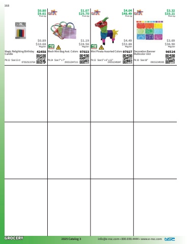 GROCERY2025 Catalog 3 info@e-nsc.com %u2022 800.690.4444 %u2022 www.e-nsc.comDecoration Banner Multicolor 10ct96524Pick Up$3.32$33.21 091512345505Pk:10 Size:18%u201d$3.69$36.90RegularMini Pinata Assorted Colors97027Pick Up$4.04$48.49 191512345847Pk:12 Size:5%u201d x 6%u201d x 12%u201d$4.49$53.88RegularMesh Mini Bag Asst. Colors97023Pick Up$1.07$25.70 391512347111Pk:24 Size:7%u201d x 7%u201d$1.19$28.56RegularMagic Relighting Birthday Candle42458Pick Up$0.80$9.61 073525131764Pk:12 Size:12 ct$0.89$10.68Regular