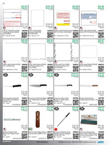 SUPPLY2025 Catalog 3 info@e-nsc.com %u2022 800.690.4444 %u2022 www.e-nsc.comVictorinox Sharpening Stone (India Combo) Extra Fine & Coarse Mexico +Tax10808Pick Up$44.15$44.15 614636855653Pk:1 Size:8%u201d x 2%u201d x 1%u201d$47.99$47.99RegularVictorinox Butcher Steel Sharpening Tool Regular Cut-Round +Tax10821Pick Up$61.08$61.08 7611160118578Pk:1 Size:14%u201d$66.39$66.39RegularKnife Holster Piggy Back w/ Clip Genuine Leather +Tax10777Pick Up$21.98$21.98 010795107778Pk:1 Size:strd$23.89$23.89RegularDexter Produce Knife Bluntnose Finger Guard +Tax10796Pick Up$19.77$19.77 010795107969Pk:1 Size:6%u201d$21.49$21.49RegularProduce Knife Wood Handle Messermeister +Tax10795Pick Up$14.99$14.99 098872153047Pk:1 Size:3.5%u201d$16.29$16.29RegularVictorinox Slicer Knife Blade 1.5%u201d Wide Nylon Handle +Tax10781Pick Up$101.93$101.93 7611160505491Pk:1 Size:14%u201d x 1.5%u201d$110.79$110.79RegularVictorinox Chef Knife Blade 2.12%u201d Wide Nylon Handle +Tax10784Pick Up$56.94$56.94 7611160501325Pk:1 Size:10%u201d x 2.12%u201d$61.89$61.89RegularVictorinox Boning Knife Semi Stiff Curved Nylon Handle +Tax10811Pick Up$28.42$28.42 7611160503817Pk:1 Size:6%u201d$30.89$30.89RegularScale Label Globe GS930B Blank 12x835/Roll69421Pick Up$64.67$64.67 Pk:1 Size:60 x 43 mm$70.29$70.29RegularScale Label Tec SL9000 Continuous Strip 2.25%u201d 16x1300/Roll16421Pick Up$65.59$65.59 Pk:1 Size:57 x 33 mm$71.29$71.29RegularScale Label Ishida AC2000 Continuous Strip 2.52%u201d 12x121/Roll16431Pick Up$60.62$60.62 Pk:1 Size:64 mm x 121%u2019$65.89$65.89RegularScale Label Ishida AC2000 UPC 12x500/ Roll16419Pick Up$63.84$63.84 Pk:1 Size:64 mm x 73 mm$69.39$69.39RegularScale Label Ishida AC300 Series UPC Shi 12x625/ Roll16427Pick Up$63.84$63.84 Pk:1 Size:59 mm x 64 mm$69.39$69.39RegularScale Label Ishida AC Series UPC Shi 12RL 12x500/Roll16423Pick Up$63.84$63.84 Pk:1 Size:64 mm x 73 mm$69.39$69.39RegularScale Label Hobart Quantum QWU300 16x1000/ Roll16426Pick Up$147.28$147.28 Pk:1 Size:2.25%u201d x 3%u201d$160.09$160.09RegularCAS LP-1000 UPC w/Safe Handling; Shi(CAS8040) 12x500/Roll16424Pick Up$52.67$52.67 Pk:1 Size:58 x 60 mm$57.25$57.25Regular