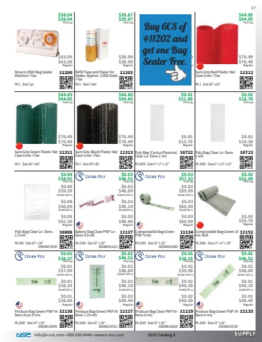 info@e-nsc.com %u2022 800.690.4444 %u2022 www.e-nsc.com 2025 Catalog 3SUPPLYProduce Bag Green PNP HiDens 6 mic11135Pick Up$0.01$46.52 606988103339Pk:3300 Size:15%u201d x 20%u201d$0.01 $48.89Asstd 120 cs$0.01$49.19Asstd 60 cs$0.01$49.49RegularProduce Bag Clear PNP HiDens 6 mic11129Pick Up$0.01$38.15 606988136603Pk:2640 Size:15%u201d x 20%u201d$0.02 $39.99Asstd 120 cs$0.02$40.29Asstd 60 cs$0.02$40.59RegularProduce Bag Green PNP HiDens 7.25 mic11127Pick Up$0.02$46.52 606988130311Pk:3000 Size:15%u201d x 20%u201d$0.02 $48.89Asstd 120 cs$0.02$49.19Asstd 60 cs$0.02$49.49RegularProduce Bag Green PNP HiDens Econ 6 mic11138Pick Up$0.01$36.37 606988136993Pk:3000 Size:14%u201d x 18%u201d$0.01 $37.99Asstd 120 cs$0.01$38.39Asstd 60 cs$0.01$38.69RegularCompostable Bag Green 10 mic Roll11152Pick Up$0.03$52.44 Pk:2000 Size:11%u201d x 4%u201d x 18%u201d$0.03$55.79RegularCompostable Bag Green PNP 9 mic11134Pick Up$0.03$57.33 606988610080Pk:1900 Size:15%u201d x 18%u201d$0.03 $59.99Asstd 120 cs$0.03$60.49Asstd 60 cs$0.03$60.99RegularBakery Bag Clear PNP LoDens 0.6 mil11137Pick Up$0.03$46.52 606988151613Pk:1500 Size:15%u201d x 20%u201d$0.03 $48.89Asstd 120 cs$0.03$49.19Asstd 60 cs$0.03$49.49RegularPoly Bag Clear Lo- Dens 1.5 mil16808Pick Up$0.08$38.91 094046078420Pk:500 Size:18%u201d x 24%u201d$0.08 $39.39Asstd 120 cs$0.08$40.69Asstd 60 cs$0.08$41.39RegularPoly Bag Clear Lo- Dens 1 mil16723Pick Up$0.02$18.76 Pk:1000 Size:6%u201d x 3.5%u201d x 15%u201d$0.02$20.39RegularPoly Bag (Cactus/Peanuts) Clear Lo- Dens 1 mil16722Pick Up$0.01$21.89 Pk:2000 Size:4%u201d x 2%u201d x 12%u201d$0.01$23.79RegularSure Grip Black Plastic Net Case Liner +Tax11313Pick Up$64.85$64.85 Pk:1 Size:36%u201dx 60%u2019$70.49$70.49RegularSure Grip Green Plastic Net Case Liner +Tax11311Pick Up$64.85$64.85 Pk:1 Size:36%u201d x 60%u2019$70.49$70.49RegularSure Grip Red Plastic Net Case Liner +Tax11312Pick Up$64.85$64.85 Pk:1 Size:36%u201d x 60%u2019$70.49$70.49Regular$0.00RegularRefill Tape and Paper for Sealer, Approx. 5,600 Seals +Tax11202Pick Up$35.87$35.87 Pk:1 Size:7 sets$38.99$38.99RegularNovem 2000 Bag Sealer Machine +Tax11200Pick Up$58.04$58.04 Pk:1 Size:1 pc$63.09$63.09RegularBuy 6CS of #11202 and get one Bag Sealer Free.