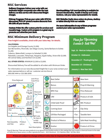 Delivery Program: Deliver your order with our dedicated freight companies who offer the best delivery on time service with discounted freight charges.Pick-up Program: Pick-up your order with SPECIAL discounted PICK-UP prices & receive discounts from 6%-20% off your invoice. Custom Print: We offer custom print for produce and reusable bags. Custom print program is a great way to promote and advertise your store.Merchandising: Full merchandising is available for General Merchandise, Health & Beauty and Candy Sections. Ask your sales representative for details.NSC Website: Easily place orders via phone, desktop or tablet directly from our website For more information in any of these programs contact your sales representative Price ReducedUnit PriceCase PriceSpecialIcons (legend on right)Item #QR Code for Item # in NSCMobile AppPack Quantityand SizeItem DescriptionPlan for Upcoming Events & Sell Big!Sept. 16 - Mexican Independence DayOctober 31 - HalloweenNovember 27 - Thanksgiving DayDecember 25 - ChristmasJanuary 1 - New Year 2026Free freight is available, check with your Sales Rep. for details. CALIFORNIA: Los Angeles and Orange County $1,000.San Bernardino, Riverside, San Diego County, Santa Barbara to Goleta $1,200.Calexico, Bakersfield, Lompoc to Soledad $1,500.Palmdale, Lancaster, Tehachapi, Hesperia, Apple Valley, Victorville $2,000.All Central Valley and Northern CA $2,500.ALL OTHER STATES: MINIMUM $2,500 to $3,000.Discounted Delivery Fee will be added to all orders with Minimum Order.For information on our new discounted freight fee in your area contact your sales representative or call our customer service line at800.690.4444 or 323.586.0200NSC Minimum Delivery ProgramProp 65 Warning: There are some products in our general merchandise section in this catalog that may contain a chemical known to the state of California to cause cancer, or other reproductive harm. ALM: Aluminum S/S: Stainless Steel N/S Non-StickDiscountTier PricesProduct UPC #Prices are subject to change without notice due to imposed tariffs and potentially new tariffs.Best SellerNew ItemBonusProp 65 WarningBPA FreePrice ReducedCRVProduct of USAChild Safe ProofWIC ProductComing SoonCLP Clip StripGift Box Packaged+TaxTaxable ItemProduct of Mexico SMH Safe Meat HandlingKosherProduct of ChinaSuavitel SP Morning Sun (Ylw)49661RegularPick UpAsstd 60 cs$8.79$35.16$8.99$35.96 $8.27$33.08 827854009078Asstd 120 cs$8.49 $33.96Pk:4 Size:105 oz