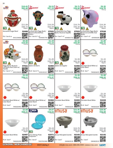 GENERAL MERCHANDISE2025 Catalog 3 info@e-nsc.com %u2022 800.690.4444 %u2022 www.e-nsc.comImusa Molcajete Granite92142Pick Up$29.42$58.84 094046020115Pk:2 Size:8%u201d$32.69$65.38RegularImusa Molcajete Granite92143Pick Up$21.41$85.64 094046020139Pk:4 Size:6%u201d$23.79$95.16RegularCinsa Dinner Plate Turquoise **92571Pick Up$4.67$28.03 7502278122468Pk:6 Size:10%u201d$5.19$31.14RegularPorcelain Bowl White92447Pick Up$2.68$64.31 794560263394Pk:24 Size:9%u201d$3.19$76.56RegularPorcelain Bowl White92444Pick Up$1.84$44.15 794560263387Pk:24 Size:8%u201d$2.19$52.56RegularPorcelain Bowl White92443Pick Up$1.50$54.13 794560263370Pk:36 Size:7%u201d$1.79$64.44RegularPorcelain Bowl White w/ Color Band92468Pick Up$3.02$72.37 794560264490Pk:24 Size:9%u201d$3.59$86.16RegularPorcelain Bowl White w/ Color Band92441Pick Up$2.34$56.17 794560264483Pk:24 Size:8%u201d$2.49$59.76RegularPorcelain Bowl White w/Color Band92472Pick Up$1.84$66.23 794560264476Pk:36 Size:7%u201d$2.19$78.84RegularSalero De Engobe92496Pick Up$2.33$55.94 031911012080Pk:24 Size:3%u201d h$2.59$62.16RegularSalero De Barro92495Pick Up$1.34$32.18 031911013117Pk:24 Size:2.5%u201d h$1.49$35.76RegularPiggy Bank/ Alcancia Cochinito Asst Colors w/ Handle97031Pick Up$9.80$19.60 091512346199Pk:2 Size:11%u201d x 7%u201d$10.89$21.78RegularLa Mexicana Piggy Bank/ Alcancia Cochinito Asst Styles97030Pick Up$9.35$18.70 81943901699Pk:2 Size:9%u201d x 8%u201d$10.39$20.78RegularLa Mexicana Cow Piggy Bank/ Alcancia Vaquita97033Pick Up$9.71$38.84 819439017752Pk:4 Size:9%u201d x 8%u201d$10.79$43.16RegularLa Mexicana Piggy Bank/ Alcancia Monita Asst. Colors97032Pick Up$9.53$57.19 819439017769Pk:6 Size:10.5%u201d x 8%u201d$10.59$63.54RegularAzucarero Sugar Bowl92448Pick Up$10.42$83.40 091512346069Pk:8 Size:16 oz$11.09$88.72Regular