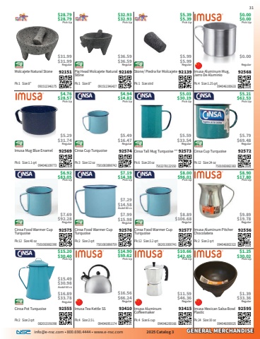 info@e-nsc.com %u2022 800.690.4444 %u2022 www.e-nsc.com 2025 Catalog 3GENERAL MERCHANDISEImusa Mexican Salsa Bowl Plastic92595Pick Up$1.25$30.02 094046000025Pk:24 Size:10 oz$1.39$33.36RegularImusa Aluminum Coffeemaker93415Pick Up$10.66$42.65 094046200166Pk:4 Size:6 cup$11.59$46.36RegularImusa Tea Kettle SS93410Pick Up$14.90$59.62 094046951174Pk:4 Size:2.5 L$16.56$66.24RegularCinsa Pot Turquoise92555Pick Up$15.20$30.40 082013191098Pk:2 Size:2 qrt$15.49$30.98Asstd 60 cs$16.89$33.78RegularImusa Aluminum Pitcher Chocolatera92556Pick Up$8.90$17.80 094046802322Pk:2 Size:2 qrt$9.89$19.78RegularCinsa Food Warmer Cup Turquoise92577Pick Up$8.00$96.01 082013000741Pk:12 Size:3.2 qrt$8.89$106.68RegularCinsa Food Warmer Cup Turquoise92576Pick Up$7.19$14.38 7501083898759Pk:2 Size:2 qrt$7.29$14.58Asstd 60 cs$7.99$15.98RegularCinsa Food Warmer Cup Turquoise92575Pick Up$6.92$83.05 7501083882390Pk:12 Size:40 oz$7.69$92.28RegularCinsa Cup Turquoise92572Pick Up$5.21$62.53 7501083882383Pk:12 Size:24 oz$5.79$69.48RegularCinsa Tall Mug Turquoise **92573Pick Up$5.03$30.19 7502278122550Pk:6 Size:20 oz$5.59$33.54RegularCinsa Cup Turquoise92574Pick Up$4.94$14.82 7501083898742Pk:3 Size:12 oz$5.49$16.47RegularImusa Mug Blue Enamel92569Pick Up$4.76$28.57 094046109773Pk:6 Size:1.1 qrt$5.29$31.74RegularImusa Aluminum Mug, Jarro De Aluminio92568Pick Up$0.00$0.00 094046100633Pk:4 Size:1.25 qrt$0.00RegularStone/ Piedra for Molcajete92139Pick Up$5.39$5.39 Pk:1 Size:strd$5.99$5.99RegularPig Head Molcajete Natural Stone92169Pick Up$32.93$32.93 091512346427Pk:1 Size:8%u201d$36.59$36.59RegularMolcajete Natural Stone92151Pick Up$28.79$28.79 091512346175Pk:1 Size:8%u201d$31.99$31.99Regular