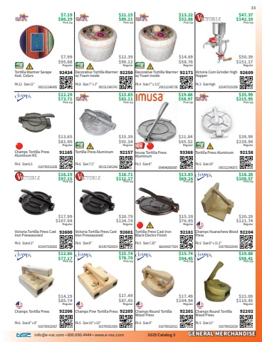 info@e-nsc.com %u2022 800.690.4444 %u2022 www.e-nsc.com 2025 Catalog 3GENERAL MERCHANDISEChamps Round Tortilla Wood Press92202Pick Up$19.88$99.41 010795922029Pk:5 Size:11%u201d$22.09$110.45RegularChamps Round Tortilla Wood Press92201Pick Up$15.74$94.45 010795922012Pk:6 Size:9%u201d$17.49$104.94RegularChamps Pine Tortilla Press92205Pick Up$15.74$78.70 010795922050Pk:5 Size:10%u201d x 10%u201d$17.49$87.45RegularChamps Tortilla Press92206Pick Up$12.86$77.17 010795922067Pk:6 Size:8%u201d x 8%u201d$14.29$85.74RegularChamps Huarachera Wood Press92204Pick Up$18.26$109.57 010795922043Pk:6 Size:8%u201d x 11.3%u201d$20.29$121.74RegularTortilla Press Cast Iron Black Electro Finish92181Pick Up$13.85$69.26 666434677029Pk:5 Size:7.25%u201d$15.39$76.95RegularVictoria Tortilla Press Cast Iron Preseasoned92601Pick Up$18.71$112.27 815457020019Pk:6 Size:8%u201d$20.79$124.74RegularVictoria Tortilla Press Cast Iron Preseasoned92600Pick Up$16.19$97.15 815457020002Pk:6 Size:6.5%u201d$17.99$107.94RegularTortilla Press Aluminum92158Pick Up$35.99$215.95 091512345871Pk:6 Size:10%u201d$39.99$239.94RegularImusa Tortilla Press Aluminum93368Pick Up$19.66$58.97 094046860087Pk:3 Size:8%u201d$21.84$65.52RegularTortilla Press Aluminum92157Pick Up$13.85$83.11 091512345246Pk:6 Size:7.5%u201d$15.39$92.34RegularChamps Tortilla Press Aluminum NS91165Pick Up$12.29$73.71 010795911658Pk:6 Size:6.5$13.65$81.90RegularVictoria Corn Grinder High Hopper92609Pick Up$47.37$142.10 815457021009Pk:3 Size:High$50.39$151.17RegularDecorative Tortilla Warmer w/ Foam Inside92171Pick Up$13.22$52.88 291512345738Pk:4 Size:7%u201d x 3.5%u201d$14.69$58.76RegularDecorative Tortilla Warmer w/ Foam Inside92250Pick Up$11.15$89.21 091512345741Pk:8 Size:7%u201d x 2%u201d$12.39$99.12RegularTortilla Warmer Sarape Asst. Colors92434Pick Up$7.19$86.29 091512346405Pk:12 Size:11%u201d$7.99$95.88Regular