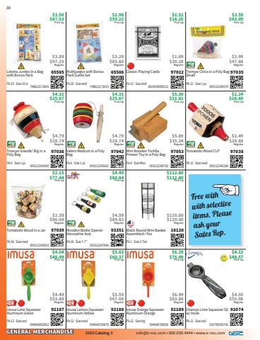 GENERAL MERCHANDISE2025 Catalog 3 info@e-nsc.com %u2022 800.690.4444 %u2022 www.e-nsc.comChamps Lime Squeezer SS w/ Hook92074Pick Up$4.13$49.57 010795920742Pk:12 Size:sml$4.59$55.08RegularImusa Orange Squeezer Aluminum Orange92189Pick Up$6.29$75.49 094046700093Pk:12 Size:lrg$6.99$83.88RegularImusa Lemon Squeezer Aluminum Yellow92188Pick Up$5.03$60.37 094046700079Pk:12 Size:med$5.59$67.08RegularImusa Lime Squeezer Aluminum Green92187Pick Up$4.04$48.49 094046002852Pk:12 Size:sml$4.49$53.88RegularBlack Round Wire Basket Assembled +Tax18120Pick Up$112.80$112.80 Pk:1 Size:3 Tier$120.00$120.00RegularWooden Bottle Opener Decorative Asst.93351Pick Up$4.49$80.84 291512347046Pk:18 Size:7.7%u201d$4.99$89.82RegularTomatodo Wood in a Jar97039Pick Up$2.15$77.44 091512345819Pk:36 Size:med$2.39$86.04RegularTomatodo Wood CLP97038Pick Up$2.24$26.89 091512345284Pk:12 Size:med$2.49$29.88RegularMini Wooden Tortilla Presser Toy in a Poly Bag97053Pick Up$5.30$31.81 091512345703Pk:6 Size:Mini$5.89$35.34RegularValero Medium in a Poly Bag97042Pick Up$4.31$25.87 091512345581Pk:6 Size:1 pc$4.79$28.74RegularTrompo Grande/ Big in a Poly Bag97036Pick Up$4.31$25.87 091512345420Pk:6 Size:1 pc$4.79$28.74RegularTrompo Chico in a Poly Bag Small97035Pick Up$3.59$43.09 091512345574Pk:12 Size:1 pc$3.99$47.88RegularClassic Playing Cards97022Pick Up$1.52$18.25 6924183900213Pk:12 Size:strd$1.69$20.28RegularMultijuegos with Bonus Pack Game Set65586Pick Up$2.96$59.22 748622173015Pk:20 Size:strd$3.29$65.80RegularLoteria Jumbo in a Bag with Bonus Pack65585Pick Up$3.50$87.53 748622172841Pk:25 Size:10 ct$3.89$97.25RegularFree with with selective items. Please ask your Sales Rep.