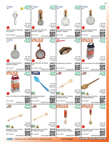 info@e-nsc.com %u2022 800.690.4444 %u2022 www.e-nsc.com 2025 Catalog 3GENERAL MERCHANDISEImusa Wood Jumbo Spoon w/ Nylon Handle93370Pick Up$3.41$13.64 094046550209Pk:4 Size:18%u201d$3.79$15.16RegularImusa Wood Cooking Paddle w/ Nylon Handle93371Pick Up$2.51$15.07 094046550230Pk:6 Size:12%u201d$2.79$16.74RegularWooden Spoon, Cuchara De Madera X-Large92176Pick Up$15.20$91.21 091512345888Pk:6 Size:26%u201d$16.89$101.34RegularWooden Spoon, Cuchara De Madera Large92174Pick Up$8.99$53.95 091512345345Pk:6 Size:23%u201d$9.99$59.94RegularWooden Spoon, Cuchara De Madera Medium92148Pick Up$7.28$43.69 091512345604Pk:6 Size:18%u201d$8.09$48.54RegularWooden Spoon, Cuchara De Madera Small92144Pick Up$4.67$56.05 091512345857Pk:12 Size:13.5%u201d$5.19$62.28RegularCinsa Serving Spoon Turquoise92154Pick Up$3.50$42.01 7501083877440Pk:12 Size:12%u201d$3.69$44.28Asstd 60 cs$3.89$46.68RegularImusa Tin Grater Four Sides92912Pick Up$4.37$52.38 094046710474Pk:12 Size:9%u201d$4.85$58.20RegularImusa Tin Grater Four Sides92911Pick Up$3.17$38.02 094046710481Pk:12 Size:8%u201d$3.52$42.24RegularLa Mexicana Ice Shaver92155Pick Up$6.38$76.57 819439010586Pk:12 Size:6 oz$7.09$85.08RegularImusa Strainer Set Plastic 2 pc93427Pick Up$5.21$31.27 094046711266Pk:6 Size:6.5%u201d & 8%u201d$5.79$34.74RegularChamps Heavy Duty SS Strainer/ Colador93428Pick Up$5.66$45.29 010795934282Pk:8 Size:10%u201d$6.29$50.32RegularChamps Heavy Duty SS Strainer/ Colador93426Pick Up$4.49$35.93 010795934268Pk:8 Size:8%u201d$4.99$39.92RegularChamps Heavy Duty SS Strainer/ Colador93425Pick Up$3.23$25.85 010795934251Pk:8 Size:6%u201d$3.59$28.72RegularChamps Heavy Duty SS Strainer/ Colador93424Pick Up$1.79$14.33 010795934244Pk:8 Size:4%u201d$1.99$15.92RegularChamps Lemon Squeezer SS w/ Hook92075Pick Up$5.03$60.37 010795920759Pk:12 Size:med$5.59$67.08Regular