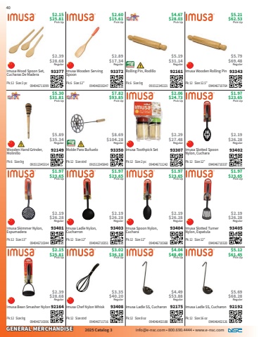 GENERAL MERCHANDISE2025 Catalog 3 info@e-nsc.com %u2022 800.690.4444 %u2022 www.e-nsc.comImusa Ladle SS, Cucharon92192Pick Up$5.12$61.45 094046402126Pk:12 Size:16 oz$5.69$68.28RegularImusa Ladle SS, Cucharon92175Pick Up$4.04$48.49 094046402188Pk:12 Size:8 oz$4.49$53.88RegularImusa Chef Nylon Whisk93408Pick Up$3.02$36.18 094046711716Pk:12 Size:strd$3.35$40.20RegularImusa Bean Smasher Nylon92164Pick Up$2.15$25.81 094046710306Pk:12 Size:lrg$2.39$28.68RegularImusa Slotted Turner Nylon, Espatula93405Pick Up$1.97$23.65 094046710320Pk:12 Size:12%u201d$2.19$26.28RegularImusa Spoon Nylon, Cuchara93404Pick Up$1.97$23.65 094046710368Pk:12 Size:12%u201d$2.19$26.28RegularImusa Ladle Nylon, Cucharron93403Pick Up$1.97$23.65 094046710351Pk:12 Size:12%u201d$2.19$26.28RegularImusa Skimmer Nylon, Espumadera93401Pick Up$1.97$23.65 094046710344Pk:12 Size:13%u201d$2.19$26.28RegularImusa Slotted Spoon Nylon, Cuchara93402Pick Up$1.97$23.65 094046710337Pk:12 Size:12%u201d$2.19$26.28RegularImusa Toothpick Set93307Pick Up$2.06$24.73 094046711242Pk:12 Size:2 pc$2.29$27.48RegularMolde Para Bu%u00f1uelo93350Pick Up$7.82$93.85 091512345840Pk:12 Size:strd$8.69$104.28RegularWooden Hand Grinder, Molinillo92149Pick Up$5.30$31.81 091512345314Pk:6 Size:lrg$5.89$35.34RegularImusa Wooden Rolling Pin93343Pick Up$5.21$62.53 094046710764Pk:12 Size:12.5%u201d$5.79$69.48RegularRolling Pin, Rodillo92161Pick Up$4.67$28.03 091512345321Pk:6 Size:lrg$5.19$31.14RegularImusa Wooden Serving Spoon93372Pick Up$2.60$15.61 094046550247Pk:6 Size:12%u201d$2.89$17.34RegularImusa Wood Spoon Set, Cucharas De Madera93377Pick Up$2.15$25.81 094046711099Pk:12 Size:3 pc$2.39$28.68Regular