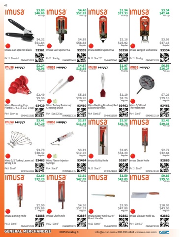 GENERAL MERCHANDISE2025 Catalog 3 info@e-nsc.com %u2022 800.690.4444 %u2022 www.e-nsc.comImusa Cleaver Knife SS92882Pick Up$9.89$39.56 094046730533Pk:4 Size:5.5%u201d$10.99$43.96RegularImusa Slicer Knife SS w/ Wood Handle92881Pick Up$3.59$43.09 094046710092Pk:12 Size:8%u201d$3.99$47.88RegularImusa Chef Knife92884Pick Up$3.92$47.09 094046710078Pk:12 Size:8%u201d$4.36$52.32RegularImusa Boning Knife92888Pick Up$2.69$32.29 094046710108Pk:12 Size:6%u201d$2.99$35.88RegularImusa Steak Knife92885Pick Up$2.45$29.38 094046710122Pk:12 Size:5%u201d$2.72$32.64RegularImusa Utility Knife92887Pick Up$2.57$30.78 094046710115Pk:12 Size:5%u201d$2.85$34.20RegularMirro Flavor Injector Syringe93464Pick Up$2.87$11.48 094046113145Pk:4 Size:8%u201d$3.19$12.76RegularMirro S/S Turkey Lacers w/ String 8 pc93463Pick Up$3.41$27.29 094046113152Pk:8 Size:6%u201d$3.79$30.32RegularMirro S/S Food Thermometer93461Pick Up$6.56$26.24 094046113114Pk:4 Size:5%u201d$7.29$29.16RegularMirro Basting Brush w/ Red Silicone Bristles93462Pick Up$1.97$7.88 094046113169Pk:4 Size:8.5%u201d$2.19$8.76RegularMirro Turkey Baster w/ Cleaning Brush93460Pick Up$4.67$18.68 094046113138Pk:4 Size:2.25 oz$5.19$20.76RegularMirro Measuring Cup Plastic (1/4, 1/3, 1/2, 1 cup)93429Pick Up$2.24$8.96 094046113183Pk:4 Size:4 pc$2.49$9.96RegularImusa Winged Corkscrew93354Pick Up$3.54$42.44 094046710528Pk:12 Size:lrg$3.93$47.16RegularImusa Bottle Opener SS93358Pick Up$1.94$23.33 094046710443Pk:12 Size:7.5%u201d$2.16$25.92RegularImusa Can Opener SS93359Pick Up$4.40$52.81 094046710405Pk:12 Size:lrg$4.89$58.68RegularImusa Can Opener Black93361Pick Up$3.89$46.66 094046710818Pk:12 Size:strd$4.32$51.84Regular