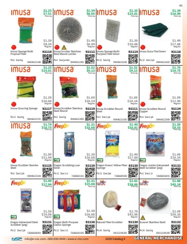 info@e-nsc.com %u2022 800.690.4444 %u2022 www.e-nsc.com 2025 Catalog 3GENERAL MERCHANDISEScourer Stainless Steel92132Pick Up$1.88$45.14 091512345390Pk:24 Size:lrg$2.09$50.16RegularNatural Fiber Scrubber92130Pick Up$1.61$38.66 091512345383Pk:24 Size:lrg$1.79$42.96RegularFregon Multi-Purpose Classic Sponge92126Pick Up$1.31$15.68 726866010105Pk:12 Size:1 ct$1.39$16.68RegularFregon Galvanized Steel Scrubber (peg)93131Pick Up$1.49$17.94 726866066003Pk:12 Size:2 pk$1.59$19.08RegularFregon Jumbo Galvanized Steel Scrubber (peg)93132Pick Up$1.59$9.53 726866016015Pk:6 Size:1 ct$1.69$10.14RegularFregon Green/ Yellow Fiber Sponge93130Pick Up$1.40$16.81 72686605030Pk:12 Size:2pk$1.49$17.88RegularFregon Scrubbing Luxe Silver92129Pick Up$1.31$15.68 72686601101Pk:12 Size:1 ct$1.39$16.68RegularImusa Scrubber Stainles Steel92125Pick Up$1.79$10.75 094046213104Pk:6 Size:2 pk$1.99$11.94RegularImusa Scrubber Round Copper92124Pick Up$1.79$10.75 094046212909Pk:6 Size:2 pk$1.99$11.94RegularImusa Scrubber Round Steel92111Pick Up$1.52$9.13 094046211506Pk:6 Size:2 pk$1.69$10.14RegularImusa Scrubber Stainless Steel Round92119Pick Up$1.52$9.13 094046213005Pk:6 Size:lrg$1.69$10.14RegularImusa Scouring Sponge92117Pick Up$1.25$15.01 094046212701Pk:12 Size:lrg$1.39$16.68RegularImusa Scour Pad Green92116Pick Up$1.34$16.09 094046212602Pk:12 Size:3 pk$1.49$17.88RegularImusa Sponge MultiPurpose Fiber Silver92114Pick Up$1.25$15.01 094046212206Pk:12 Size:lrg$1.39$16.68RegularImusa Scruber Stainless Steel Round Jumbo92112Pick Up$1.34$8.05 094046211902Pk:6 Size:jumbo$1.49$8.94RegularImusa Sponge Multi Purpose Fiber92110Pick Up$1.25$7.51 094046211308Pk:6 Size:lrg$1.39$8.34Regular