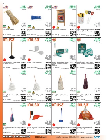 GENERAL MERCHANDISE2025 Catalog 3 info@e-nsc.com %u2022 800.690.4444 %u2022 www.e-nsc.comImusa Upright Broom w/ Wood Handle92932Pick Up$5.84$70.09 094046901025Pk:12 Size:48%u201d$6.49$77.88RegularImusa Retractable Dustpan w/ Metal Handle92938Pick Up$4.85$58.21 094046602601Pk:12 Size:strd$5.39$64.68RegularImusa Dustpan & Brush Set Handheld93016Pick Up$4.40$26.41 094046902060Pk:6 Size:strd$4.89$29.34RegularString Microfiber Deck Mop Multicolor92939Pick Up$4.04$48.49 7502214560460Pk:12 Size:#24$4.49$53.88RegularString (Hilaza) Deck Mop Multicolor92931Pick Up$4.40$52.81 6045230050511Pk:12 Size:#24$4.89$58.68RegularString (Hilaza) Deck Mop92923Pick Up$4.40$52.81 604523005051Pk:12 Size:#24$4.89$58.68RegularString Cotton Mop w/ Wood Handle92930Pick Up$3.77$45.25 604523005025Pk:12 Size:#24$4.19$50.28RegularString Cotton Mop w/ Wood Handle92927Pick Up$3.59$43.09 604523002048Pk:12 Size:#22$3.99$47.88RegularScotch-Brite Power Scour Toilet Cleaner Tablet Refill92216Pick Up$6.56$26.24 076308414375Pk:4 Size:8 pc$7.29$29.16RegularScotch-Brite Power Scour Toilet Cleaner ( 1 Wand, 5 Tablets)92215Pick Up$10.43$41.72 076308414108Pk:4 Size:Set$11.59$46.36RegularImusa Toilet Brush Set93011Pick Up$4.04$24.25 094046604636Pk:6 Size:5%u201d x 20%u201d H%u201d$4.49$26.94RegularImusa Plunger Heavy Duty w/ Wood Handle93012Pick Up$3.68$22.09 094046901032Pk:6 Size:21%u201d$4.09$24.54RegularTraditional Flyswatter Asst. Colors w/ Floor Display92948Pick Up$0.62$89.42 072477981144Pk:144 Size:strd$0.69$99.36RegularWashboard Lavadero92652Pick Up$18.62$111.73 091512345369Pk:6 Size:lrg$20.69$124.14RegularEscobeta Plastic Assorted Colors92179Pick Up$3.05$36.61 091512345413Pk:12 Size:strd$3.39$40.68RegularEscobeta De Raiz92162Pick Up$2.24$26.89 091512345406Pk:12 Size:strd$2.49$29.88Regular