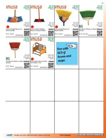 info@e-nsc.com %u2022 800.690.4444 %u2022 www.e-nsc.com 2025 Catalog 3GENERAL MERCHANDISEImusa Mop & Broom Rack -36 Holders +Tax18008Pick Up$82.80$82.80 094046051003Pk:1 Size:strd$92.00$92.00RegularFan Broom Plastic w/ Wood Handle92926Pick Up$3.32$66.42 7502214560170Pk:20 Size:lrg$3.69$73.80RegularFan Broom Plastic w/ Wood Handle92922Pick Up$3.23$64.62 7502214560163Pk:20 Size:med$3.59$71.80RegularImusa Angle Broom w/ Metal Handle92936Pick Up$5.03$60.37 094046000421Pk:12 Size:48%u201d$5.59$67.08RegularImusa Indoor Straight Broom w/ Metal Handle92933Pick Up$6.11$36.67 094046902084Pk:6 Size:46%u201d$6.79$40.74RegularImusa Straight Broom w/ Wood Handle92934Pick Up$4.49$53.89 094046901018Pk:12 Size:48%u201d$4.99$59.88RegularFree with 6CS of broom andmops.