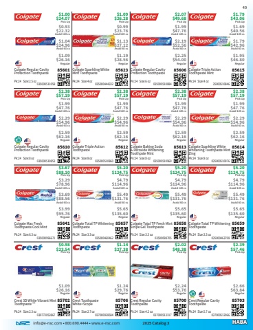 info@e-nsc.com %u2022 800.690.4444 %u2022 www.e-nsc.com 2025 Catalog 3HABAColgate Regular Cavity Protection Toothpaste85601Pick Up$1.00$24.07 035000511058Pk:24 Size:2.5 oz$0.93 $22.32Asstd 120 cs$1.04$24.96Asstd 60 cs$1.09$26.16RegularColgate Sparkling White Mint Toothpaste85623Pick Up$1.09$26.28 035000444332Pk:24 Size:4 oz$0.99 $23.76Asstd 120 cs$1.13$27.12Asstd 60 cs$1.19$28.56RegularColgate Regular Cavity Protection Toothpaste85606Pick Up$2.07$49.68 035000510884Pk:24 Size:6 oz$1.99 $47.76Asstd 120 cs$2.19$52.56Asstd 60 cs$2.25$54.00RegularColgate Triple Action Toothpaste Mint85615Pick Up$1.79$43.06 35000510846Pk:24 Size:4 oz$1.69 $40.56Asstd 120 cs$1.79$42.96Asstd 60 cs$1.95$46.80RegularColgate Regular Cavity Protection Toothpaste85610Pick Up$2.38$57.19 035000510853Pk:24 Size:8 oz$1.99 $47.76Asstd 120 cs$2.29$54.96Asstd 60 cs$2.59$62.16RegularColgate Triple Action Toothpaste85612Pick Up$2.38$57.19 035000510860Pk:24 Size:8 oz$1.99 $47.76Asstd 120 cs$2.29$54.96Asstd 60 cs$2.59$62.16RegularColgate Baking Soda & Peroxide Whitening Toothpste Mint85613Pick Up$2.38$57.19 035000510969Pk:24 Size:8 oz$1.99 $47.76Asstd 120 cs$2.29$54.96Asstd 60 cs$2.59$62.16RegularColgate Sparkling White Whitening Toothpaste Mint Zing85614Pick Up$2.38$57.19 035000510976Pk:24 Size:8 oz$1.99 $47.76Asstd 120 cs$2.29$54.96Asstd 60 cs$2.59$62.16RegularColgate Max Fresh Toothpaste Cool Mint85641Pick Up$3.67$88.10 035000996671Pk:24 Size:6.3 oz$3.29 $78.96Asstd 120 cs$3.69$88.56Asstd 60 cs$3.99$95.76RegularColgate Total TP Whitening Toothpaste85657Pick Up$5.20$124.75 035000460462Pk:24 Size:3.3 oz$4.79 $114.96Asstd 120 cs$5.49$131.76Asstd 60 cs$5.65$135.60RegularColgate Total TP Fresh Mint Stripe Gel Toothpaste85658Pick Up$5.20$124.75 03500098705Pk:24 Size:3.3 oz$4.79 $114.96Asstd 120 cs$5.49$131.76Asstd 60 cs$5.65$135.60RegularColgate Total TP Whitening Toothpaste85659Pick Up$5.20$124.75 035000463708Pk:24 Size:3.3 oz$4.79 $114.96Asstd 120 cs$5.49$131.76Asstd 60 cs$5.65$135.60RegularCrest 3D White Vibrant Mint Toothpaste **85702Pick Up$0.98$23.54 030772053867Pk:24 Size:2.3 oz$1.09$26.16RegularCrest Toothpaste White+Scope85706Pick Up$1.14$27.38 037000928584Pk:24 Size:2.7 oz$1.24$29.76RegularCrest Regular Cavity Toothpaste85700Pick Up$2.02$48.38 037000513117Pk:24 Size:4.2 oz$2.24$53.76RegularCrest Regular Cavity Toothpaste85703Pick Up$2.39$57.46 037000512066Pk:24 Size:5.7 oz$2.66$63.84Regular