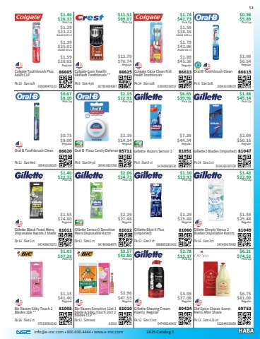 info@e-nsc.com %u2022 800.690.4444 %u2022 www.e-nsc.com 2025 Catalog 3HABAOld Spice Classic Scent Men%u2019s After Shave69753Pick Up$6.21$74.52 012044010693Pk:12 Size:4.25 oz$6.75$81.00RegularGillette Shaving Cream Foamy Regular80424Pick Up$2.78$33.37 047400240407Pk:12 Size:11 oz$3.09$37.08RegularBic Razors Sensitive 12ct 1 blade & Silky Touch 10ct 2 blades CLP **81010Pick Up$3.57$42.80 81010Pk:12 Size:asst$3.96$47.55RegularBic Razors Silky Touch 2 Blades 2pk **81005Pick Up$1.03$37.26 070330916142Pk:36 Size:2 ct$1.15$41.40RegularGillete Simply Venus 2 Blades Disposable Razors81049Pick Up$1.43$22.90 047400670082Pk:16 Size:3 ct$1.59$25.44RegularGillette Blue II Plus (Imported)81060Pick Up$1.16$13.93 8888855001432Pk:12 Size:2 ct$1.29$15.48RegularGillette Sensor3 Sensitive Mens Disposable Razor81012Pick Up$2.06$24.73 047400664975Pk:12 Size:1 ct$2.29$27.48RegularGillette Black Fixed Mens Disposable Razors 2 blade81011Pick Up$1.40$22.32 047400670372Pk:16 Size:3 ct$1.55$24.80RegularGillette2 Blades (Imported)81047Pick Up$1.88$45.14 3014260287030Pk:24 Size:5 ct$2.09$50.16RegularGillette Razors Sensor 281051Pick Up$6.65$39.91 047400658530Pk:6 Size:5 ct$7.39$44.34RegularOral B Floss Cavity Defense85711Pick Up$2.15$12.91 300410825768Pk:6 Size:54 yd$2.39$14.34RegularOral B Toothbrush Clean86620Pick Up$0.67$8.10 300410109325Pk:12 Size:Med$0.75$9.00RegularOral B Toothbrush Clean86615Pick Up$0.98$5.89 300410108670Pk:6 Size:Soft$1.09$6.54RegularColgate Extra Clean Full Head Toothbrush86613Pick Up$1.74$41.73 035000550057Pk:24 Size:soft$1.59 $38.16Asstd 120 cs$1.79$42.96Asstd 60 cs$1.89$45.36RegularColgate Gum Health Uktrasft Toothbrush **86625Pick Up$11.51$69.07 827854004387Pk:6 Size:4 pk$12.79$76.74RegularColgate Toothbrush Plus Adult CLP86605Pick Up$1.46$26.33 035000470133Pk:18 Size:soft$1.29 $23.22Asstd 120 cs$1.39$25.02Asstd 60 cs$1.59$28.62Regular