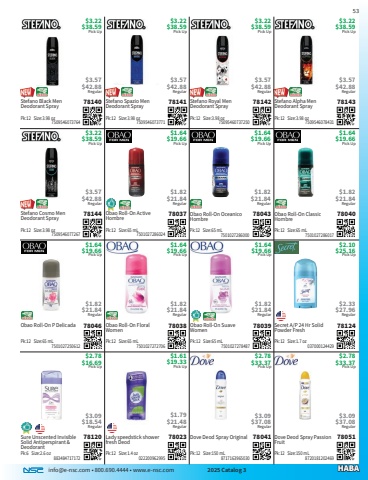 info@e-nsc.com %u2022 800.690.4444 %u2022 www.e-nsc.com 2025 Catalog 3HABADove Deod Spray Passion Fruit78051Pick Up$2.78$33.37 8720181202469Pk:12 Size:150 mL$3.09$37.08RegularDove Deod Spray Original78041Pick Up$2.78$33.37 8717163965030Pk:12 Size:150 mL$3.09$37.08RegularLady speedstick shower fresh Deod78023Pick Up$1.61$19.33 022200962995Pk:12 Size:1.4 oz$1.79$21.48RegularSure Unscented Invisible Solid Antiperspirant & Deodorant78120Pick Up$2.78$16.69 883484717172Pk:6 Size:2.6 oz$3.09$18.54RegularSecret A/P 24 Hr Solid Powder Fresh78124Pick Up$2.10$25.16 037000124429Pk:12 Size:1.7 oz$2.33$27.96RegularObao Roll-On Suave Women78039Pick Up$1.64$19.66 7501027278487Pk:12 Size:65 mL$1.82$21.84RegularObao Roll-On Floral Women78038Pick Up$1.64$19.66 7501027272706Pk:12 Size:65 mL$1.82$21.84RegularObao Roll-On P Delicada78046Pick Up$1.64$19.66 7501027250612Pk:12 Size:65 mL$1.82$21.84RegularObao Roll-On Classic Hombre78040Pick Up$1.64$19.66 7501027286017Pk:12 Size:65 mL$1.82$21.84RegularObao Roll-On Oceanico Hombre78043Pick Up$1.64$19.66 7501027286000Pk:12 Size:65 mL$1.82$21.84RegularObao Roll-On Active Hombre78037Pick Up$1.64$19.66 7501027286024Pk:12 Size:65 mL$1.82$21.84RegularStefano Cosmo Men Deodorant Spray78144Pick Up$3.22$38.59 7509546077267Pk:12 Size:3.98 oz$3.57$42.88RegularStefano Alpha Men Deodorant Spray78143Pick Up$3.22$38.59 7509546078431Pk:12 Size:3.98 oz$3.57$42.88RegularStefano Royal Men Deodorant Spray78142Pick Up$3.22$38.59 75095460737250Pk:12 Size:3.98 oz$3.57$42.88RegularStefano Spazio Men Deodorant Spray78141Pick Up$3.22$38.59 7509546073771Pk:12 Size:3.98 oz$3.57$42.88RegularStefano Black Men Deodorant Spray78140Pick Up$3.22$38.59 7509546073764Pk:12 Size:3.98 oz$3.57$42.88Regular
