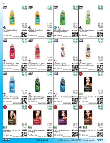 HABA2025 Catalog 3 info@e-nsc.com %u2022 800.690.4444 %u2022 www.e-nsc.comD De La Vega Hair Dye 6.7 Chocolate81907Pick Up$2.72$8.15 855313002087Pk:3 Size:1 Appl$2.89$8.67RegularD De La Vega Hair Dye 4.6 Burgundy81906Pick Up$2.72$8.15 855313002070Pk:3 Size:1 Appl$2.89$8.67RegularD De La Vega Hair Dye 4.5 Mahogany81905Pick Up$2.72$8.15 855313002063Pk:3 Size:1 Appl$2.89$8.67RegularD De La Vega Hair Dye 3.0 Dark Brown81904Pick Up$2.72$8.15 855313002025Pk:3 Size:1 Appl$2.89$8.67RegularD De La Vega Hair Dye 2.0 Black 1Appl81903Pick Up$2.72$8.15 855313002018Pk:3 Size:1 Appl$2.89$8.67RegularVO5 3-in-1 Ocean Surge SH/CD/BW81811Pick Up$1.49$8.96 816559015149Pk:6 Size:15 oz$1.66$9.96RegularVO5 3-in-1 Fresh Energy Shampoo -Conditioner - Bodywash81810Pick Up$1.49$8.96 816559015156Pk:6 Size:15 oz$1.66$9.96RegularVO5 2 in 1 Moisturizing Shampoo & Conditioner81889Pick Up$1.49$8.96 816559019765Pk:6 Size:15 oz$1.66$9.96RegularV05 Island Coconut Moisturizing Shampoo81888Pick Up$1.49$8.96 816559011431Pk:6 Size:15 oz$1.66$9.96RegularV05 Island Coconut Moisturizing Conditioner81887Pick Up$1.49$8.96 816559011448Pk:6 Size:15 oz$1.66$9.96RegularV05 Strawberry & Cream Moisturizing Conditioner81886Pick Up$1.49$8.96 816559011189Pk:6 Size:15 oz$1.66$9.96RegularV05 Strawberry & Cream Moisturizing Shampoo81883Pick Up$1.49$8.96 816559011172Pk:6 Size:15 oz$1.66$9.96RegularV05 Kiwi Lime Squeeze Conditioner81885Pick Up$1.49$8.96 816559011073Pk:6 Size:15 oz$1.66$9.96RegularV05 Kiwi Lime Squeeze Clarifying Shampoo81882Pick Up$1.49$8.96 816559011066Pk:6 Size:15 oz$1.66$9.96RegularVO5 Daily Revitalizing Conditioner81812Pick Up$1.49$8.96 816559018775Pk:6 Size:15 oz$1.66$9.96RegularV05 Daily Revitalizing Shampoo81881Pick Up$1.49$8.96 816559017914Pk:6 Size:15 oz$1.66$9.96Regular